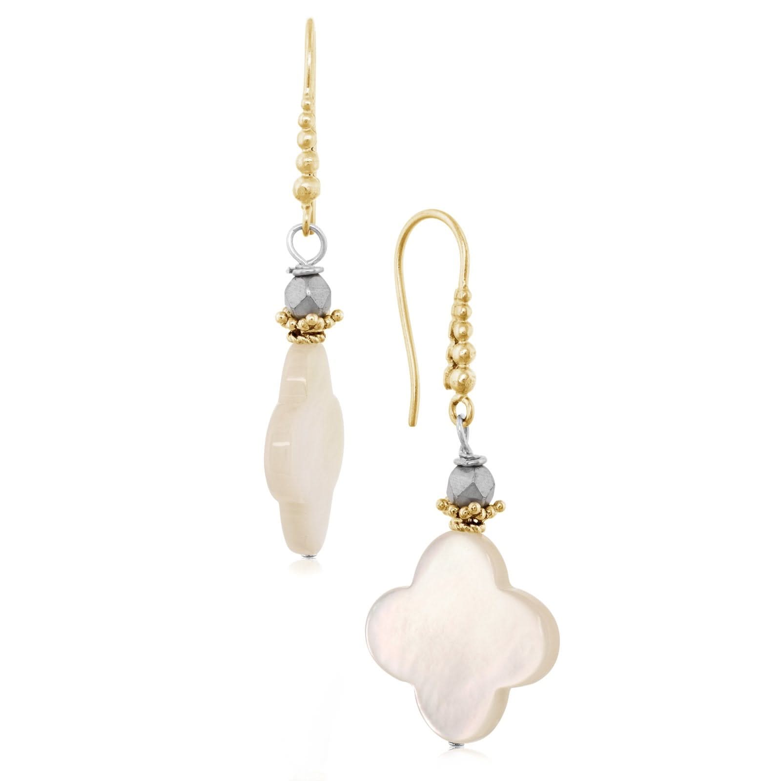 Sterling silver mother of pearl clover shaped earrings. The earrings feature gold and hematite details. Designed by Jill Duzan.