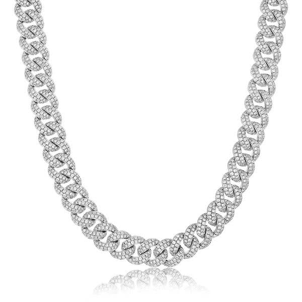 14K white gold diamond pave curb link chain from the Reis-Nichols Collection. The necklace features 2002 round brilliant cut diamonds weighing approximately 27 ctw. The chain measures 22" in length.
