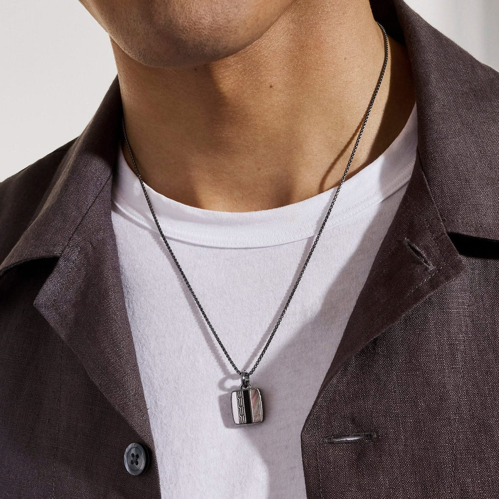 Sterling silver and black rhodium Carved Chain pendant necklace featuring black onyx, hematite, and black mother of pearl. The pendant is featured on a 22" box chain. Designed by John Hardy.