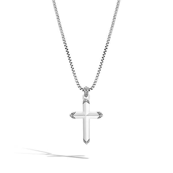 Sterling silver Classic Chain cross pendant on 2.7mm box chain. The necklace measures 26" in length. Designed by John Hardy.