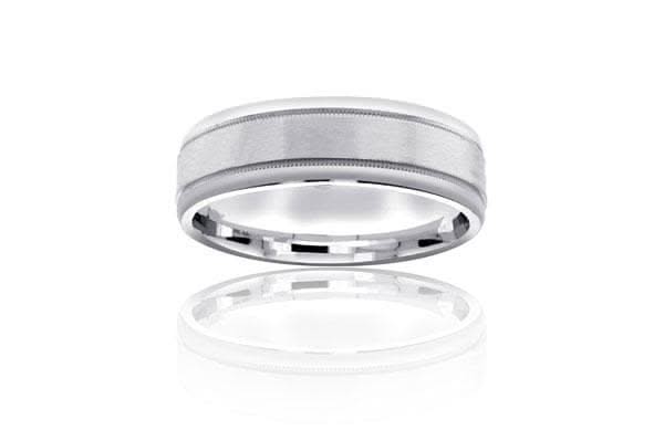 Men's comfort fit wedding band from the Reis-Nichols Collection. The band features a satin center and miligraining finish. The band is 6.5mm wide. Special order sizes available. Pricing may vary with size of ring.
