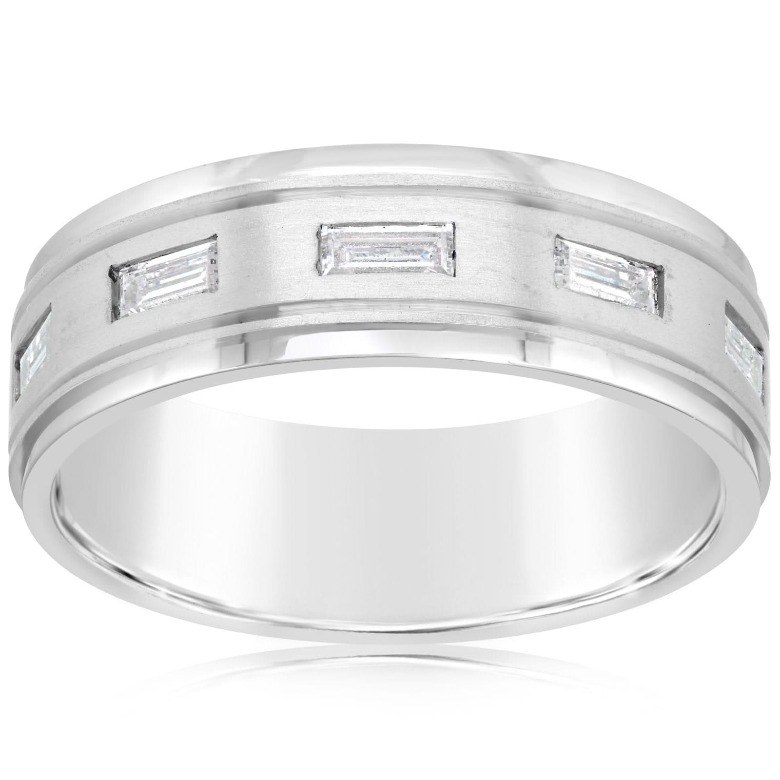 14K white gold diamond wedding band from the Reis-Nichols collection. The ring features five baguette diamonds weighing .40 ctw. The band is 7mm wide. Special order sizes also available. Pricing may vary with size of ring.