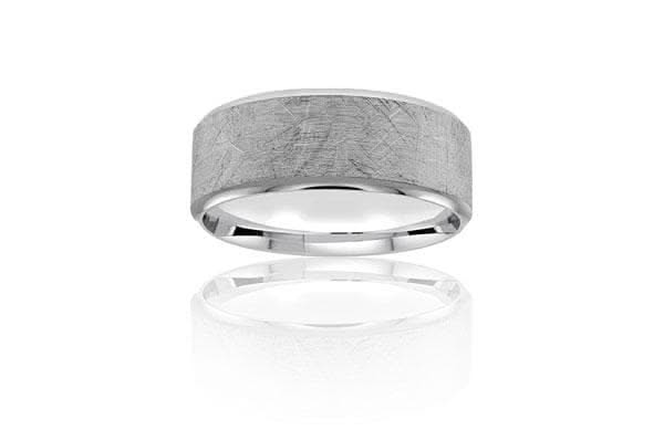 Men's 14K white gold comfort fit wedding band with a crystalline finish. The band is 8mm wide. Visit our store to view our entire collection of over 1,000 wedding bands.