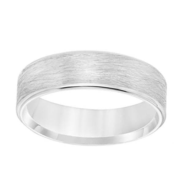 14K white gold wedding band from the Reis-Nichols Collection. The band features a wire finish center and high polish edges. The band is 6mm wide. Please call or email for size information and availability. Visit either our Indianapolis/Fashion Mall Commons or Greenwood store to view our entire collection of more than 1,000 men's wedding bands.