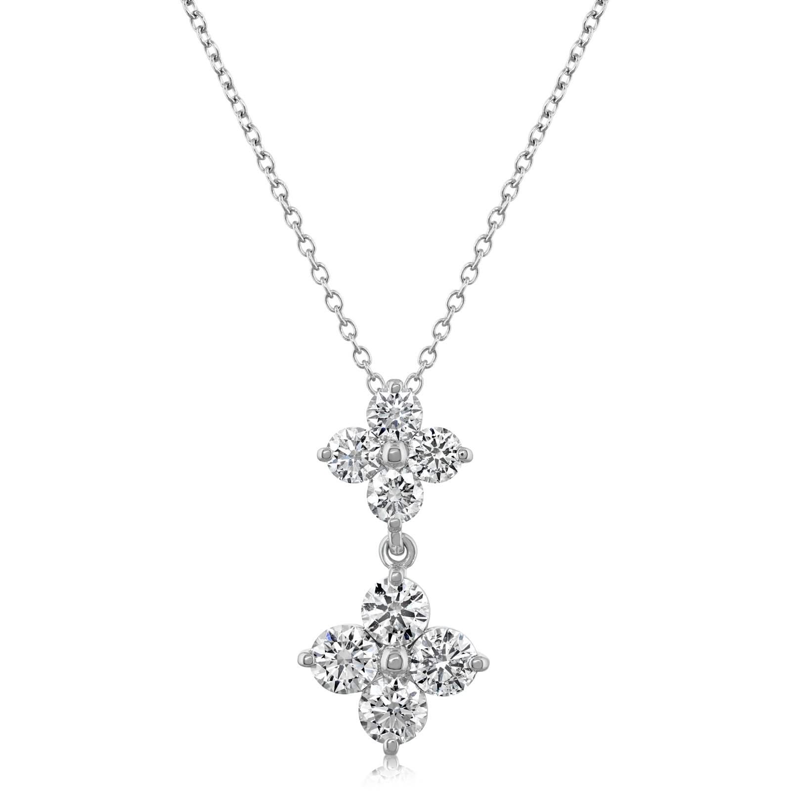 14K white gold 16-18" diamond double cluster pendant from the Reis-Nichols Collection. The pendant features eight round brilliant cut diamonds weighing 1.51 ctw.