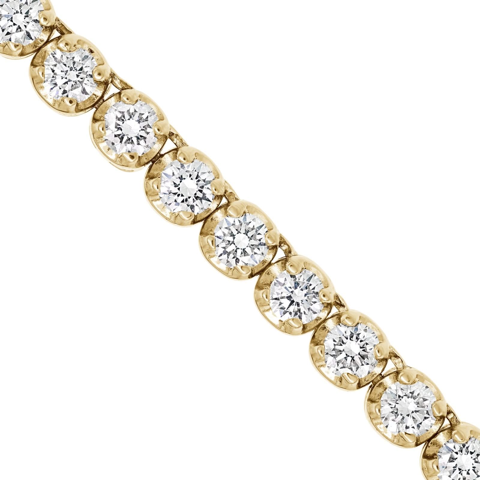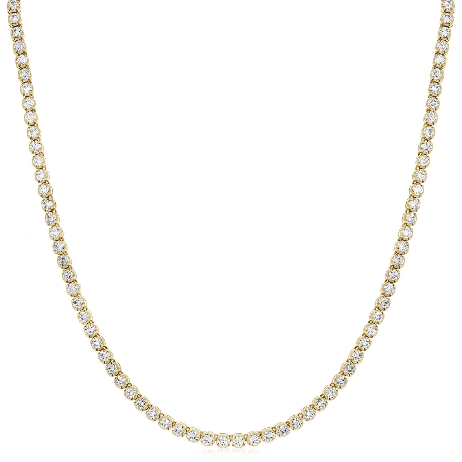 14K yellow gold 17" diamond non graduated tennis necklace from the Reis-Nichols Collection. The necklace features 110 round brilliant cut diamonds weighing over 9 1/2ctw. Pricing may vary depending on size and materials.