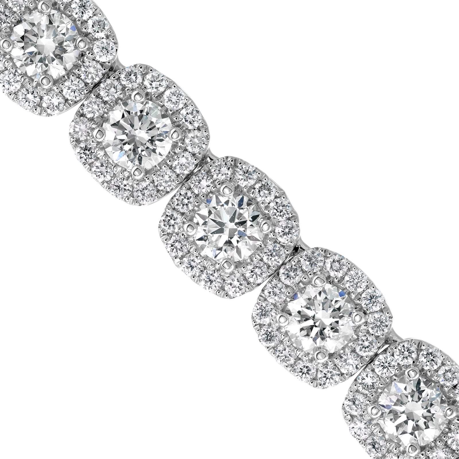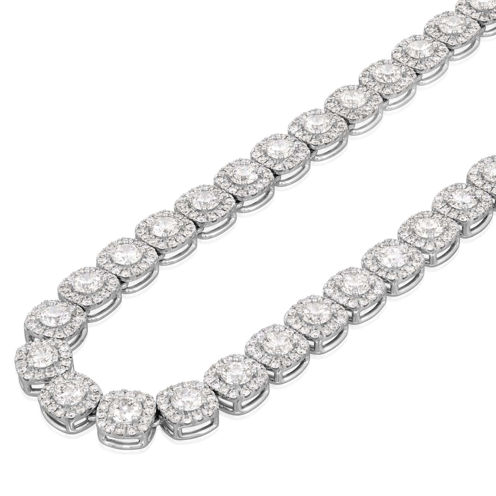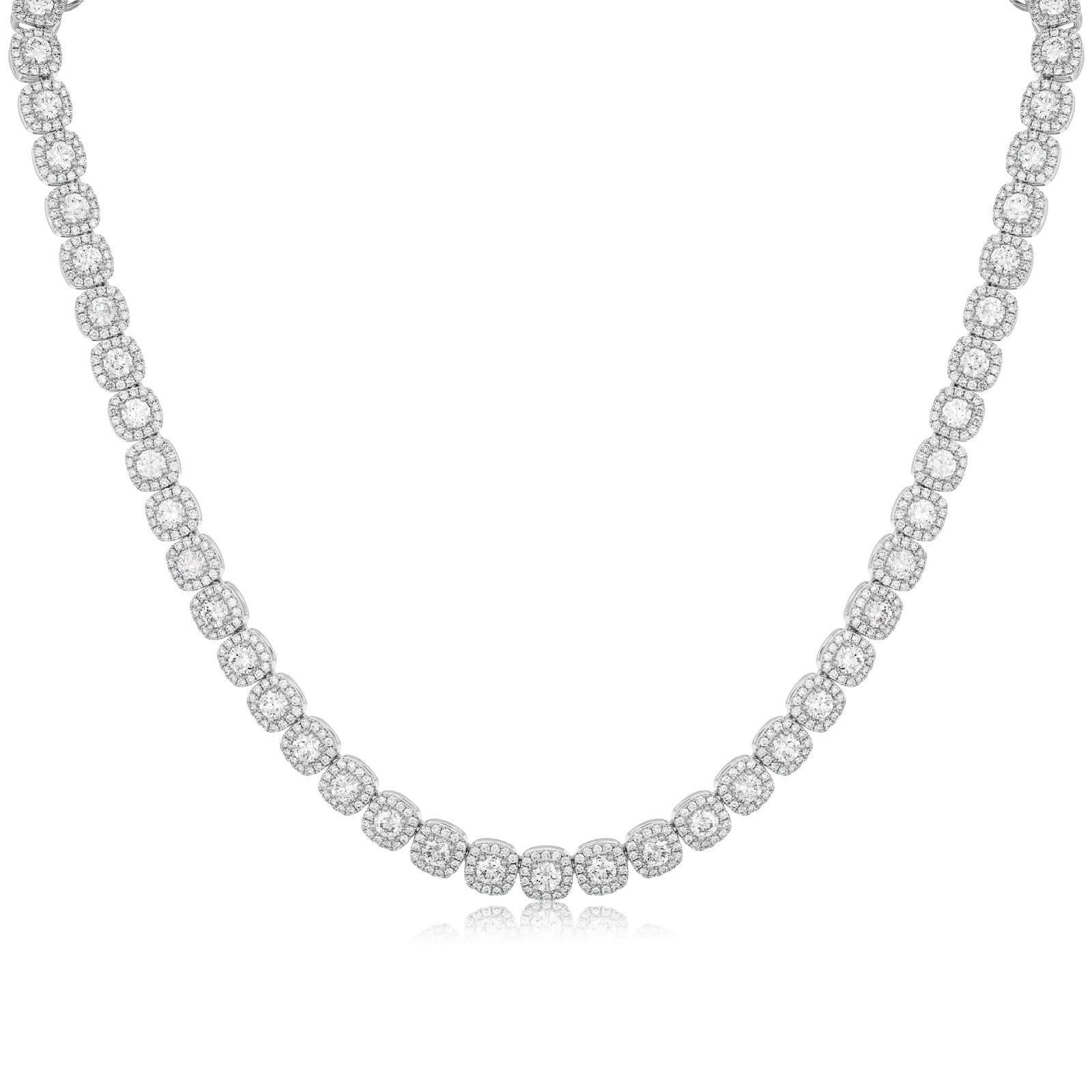 18K white gold diamond halo necklace featuring 915 round brilliant cut diamonds weighing 17.38 ctw. The necklace is 16" in length.