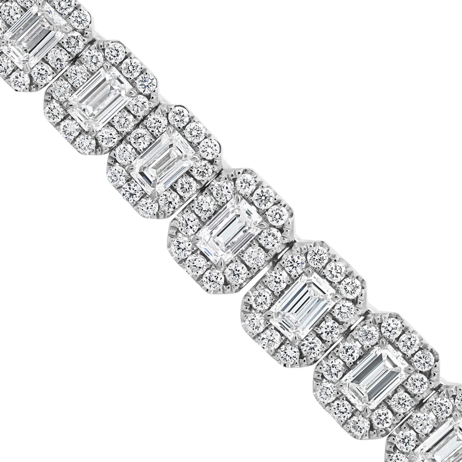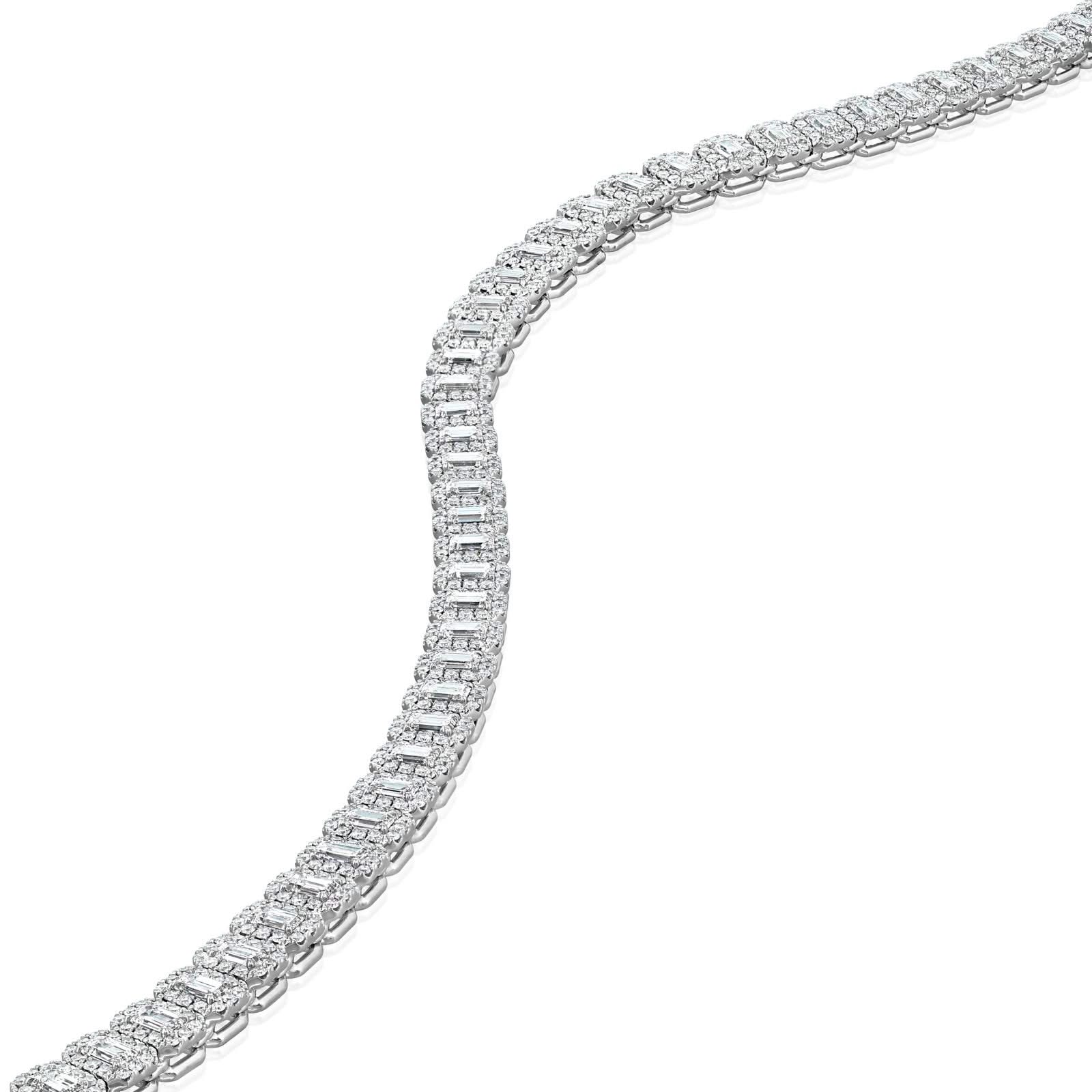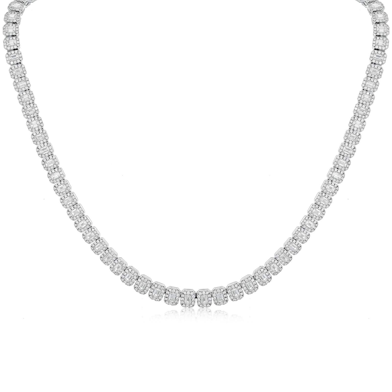 18K white gold diamond necklace from the Reis-Nichols Collection. The necklace features 82 emerald cut diamonds weighing 9.81 ctw and 984 round brilliant cut diamonds weighing 4.73 ctw. The necklace is 16'' in length.