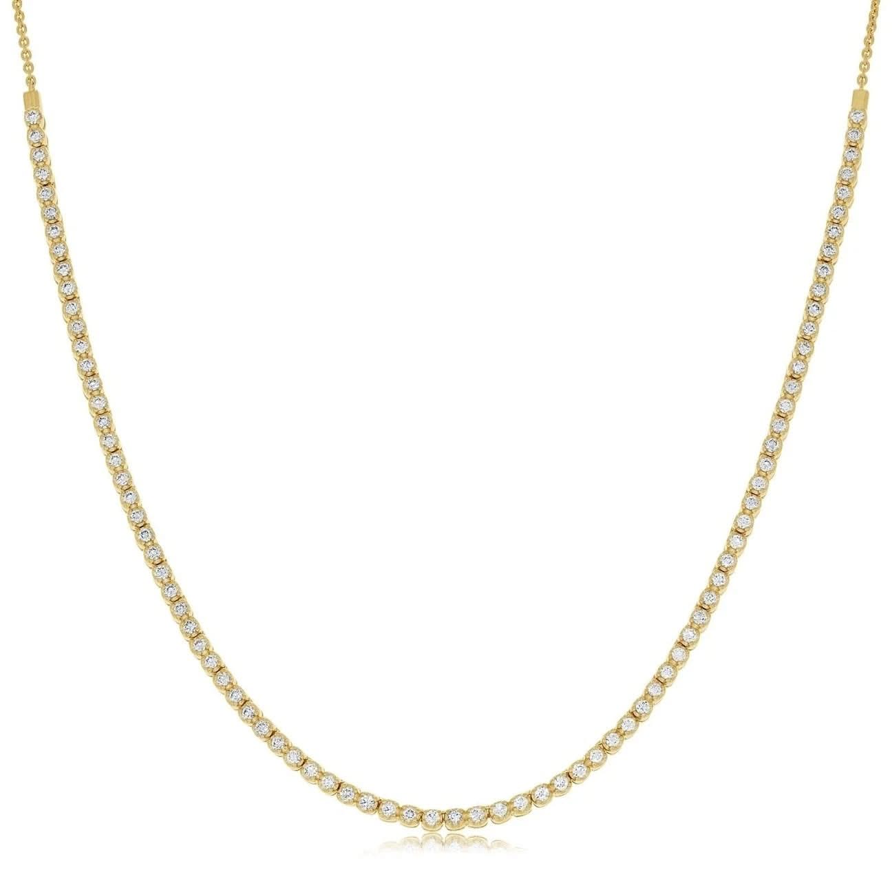 14K yellow gold diamond tennis necklace on a chain from the Reis-Nichols Collection. The necklace features 81 round brilliant cut diamonds weighing over 2 ctw. The necklace is adjustable from 15-16.5" in length.