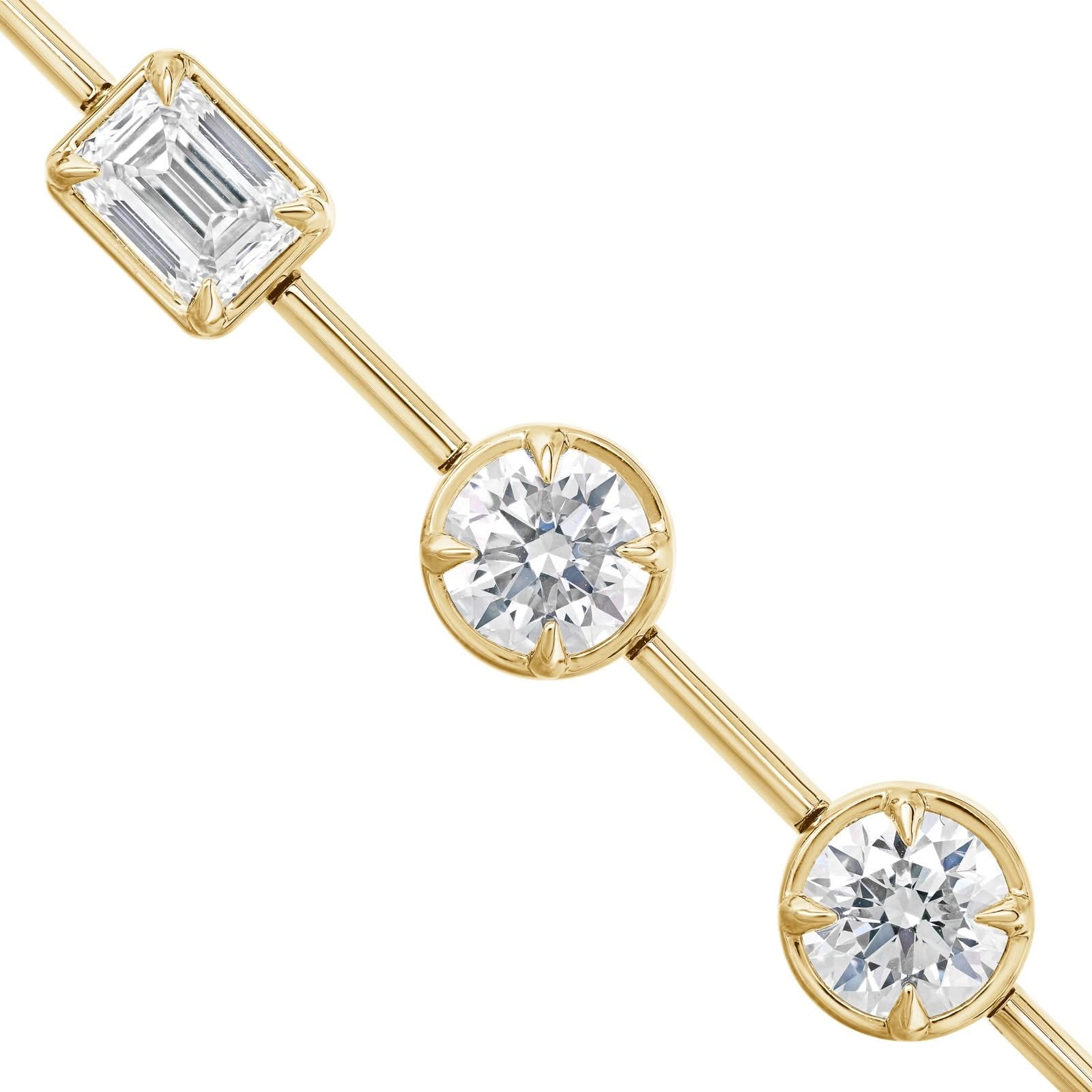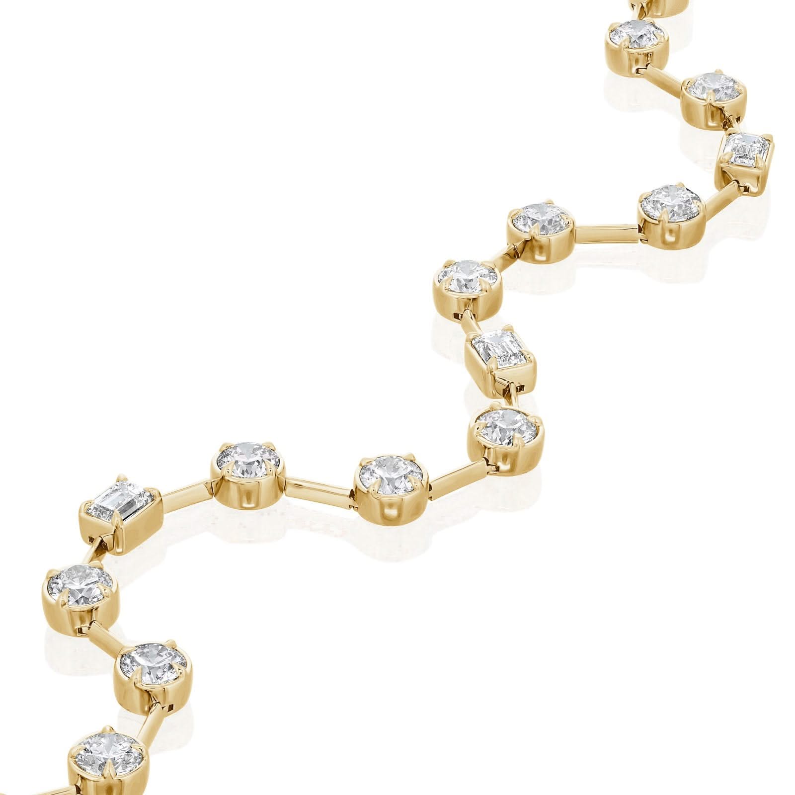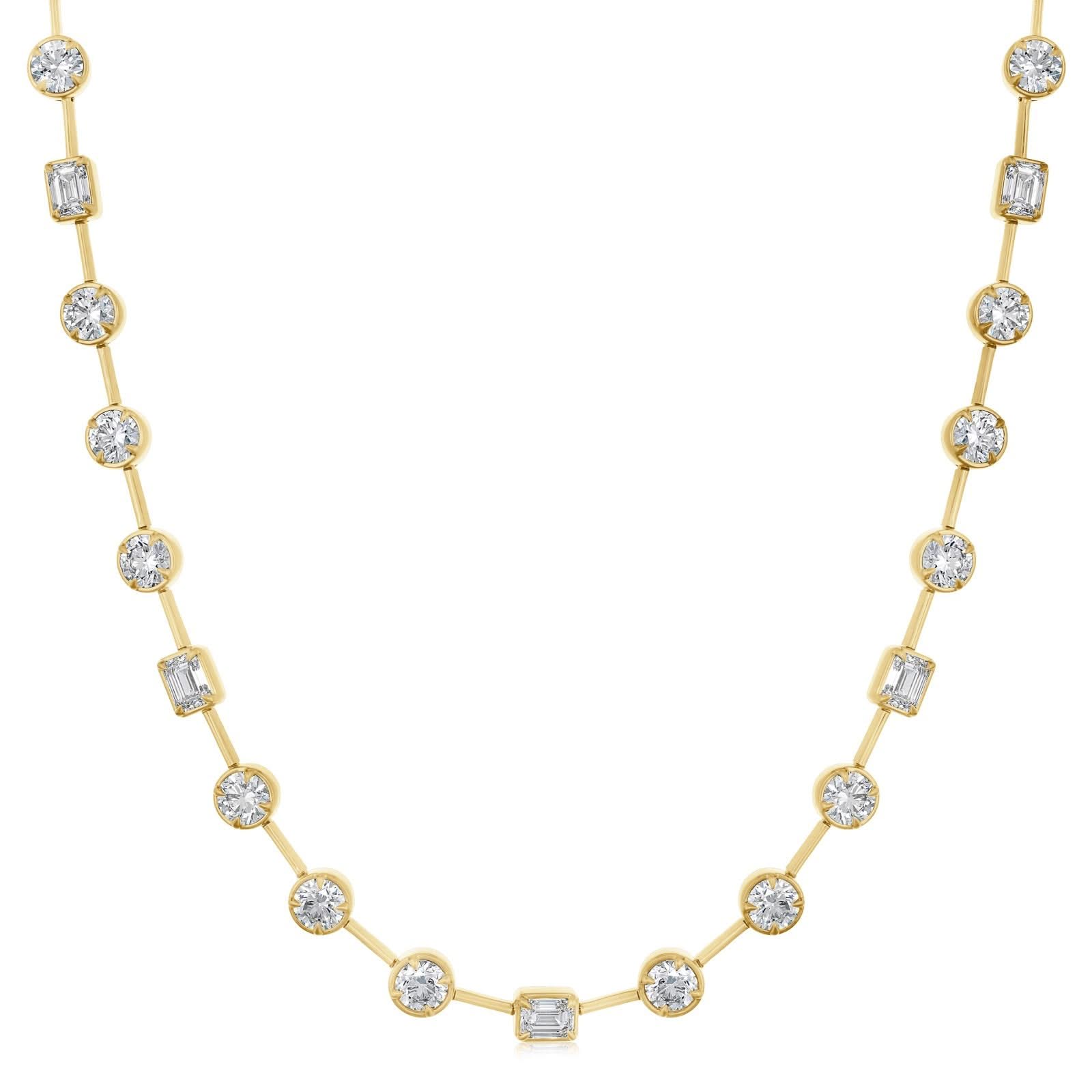 18K yellow gold round and emerald cut diamond necklace featuring 24 round brilliant cut and eight emerald cut diamonds weighing 22.73 ctw. The necklace is 17" in length.