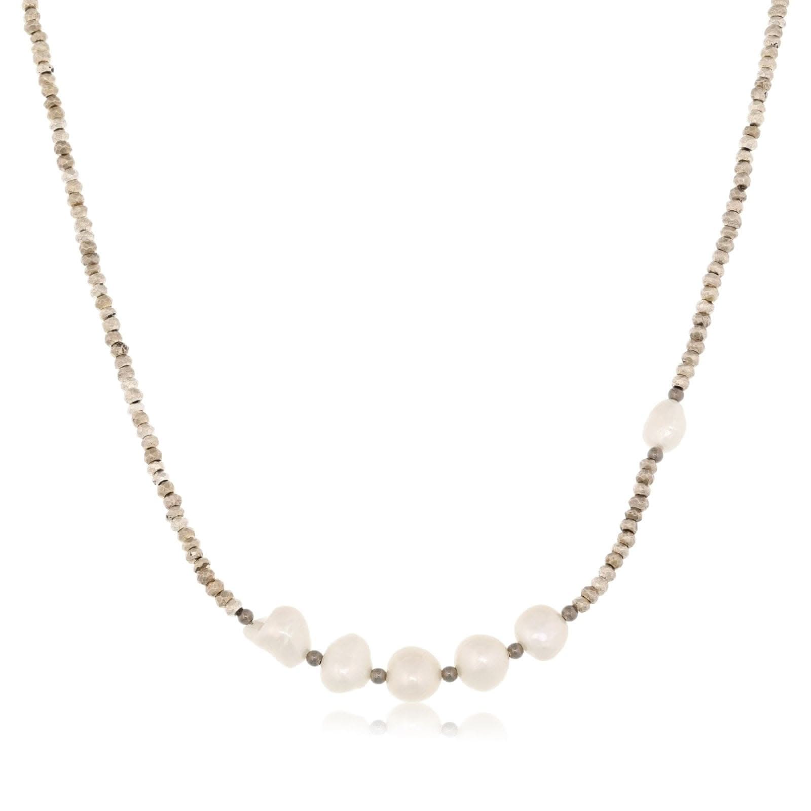 14K white gold 16" silver pyrite bead & baroque pearl necklace designed and created by Reis-Nichols Jewelers. The necklace features six baroque pearls and silver pyrite beads.