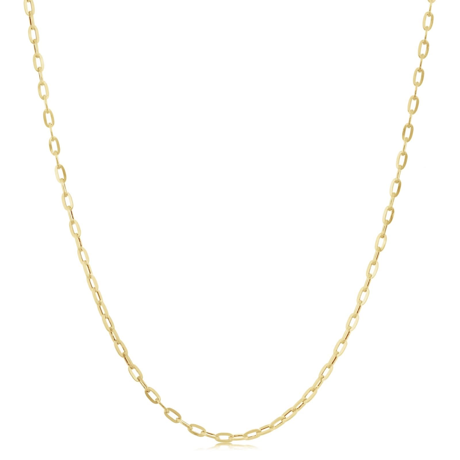 One 18k yellow gold flat oval link chain. The chain measures approximately 18 inches in length and features a lobster clasp. Designed by Doves. Special orders may be available. Please inquire for availability. Pricing is determined by the designer and may vary based on size and materials.