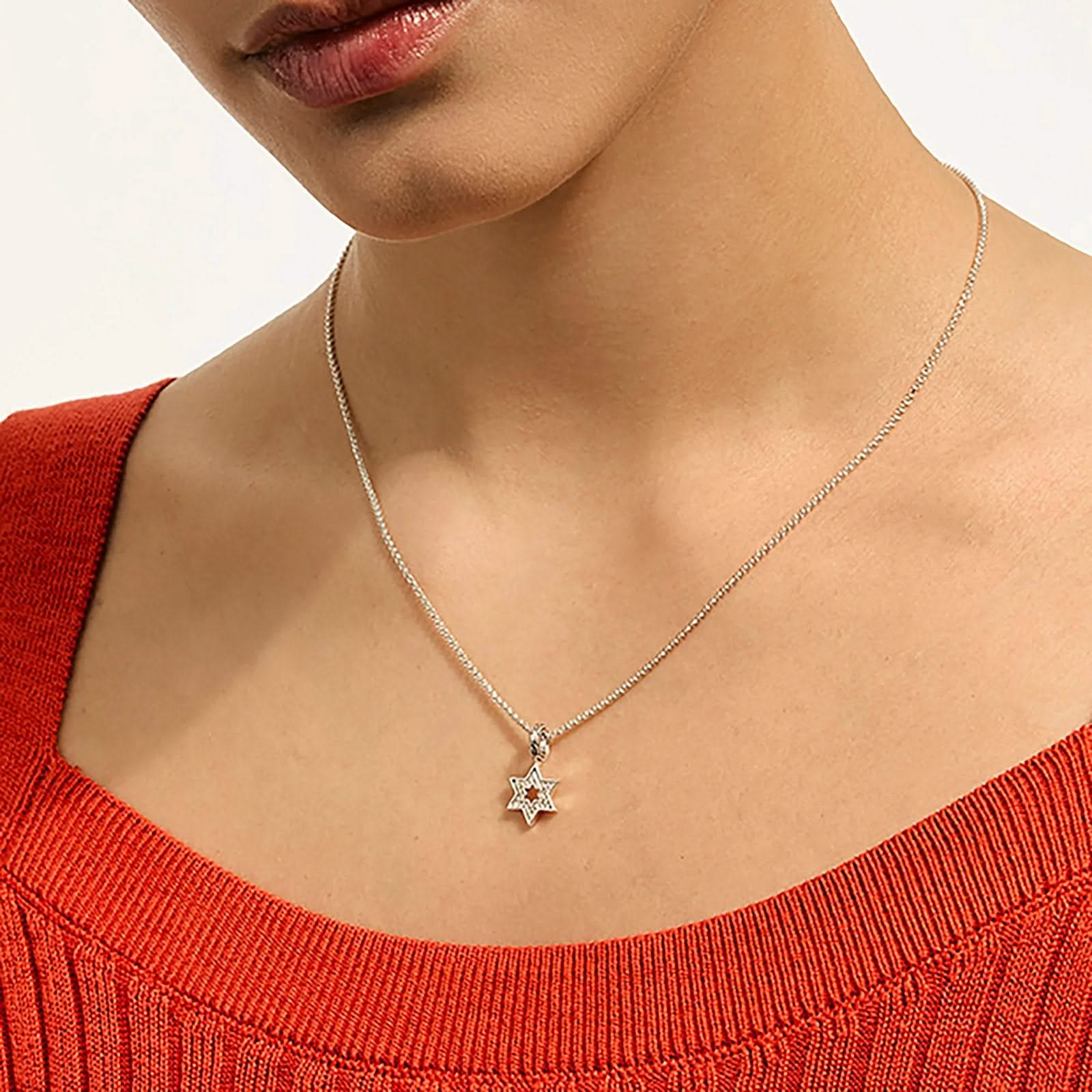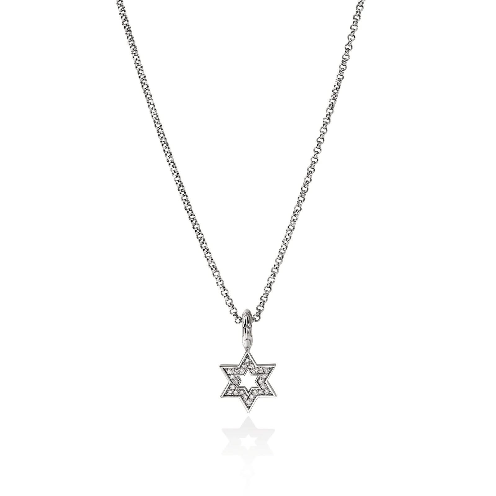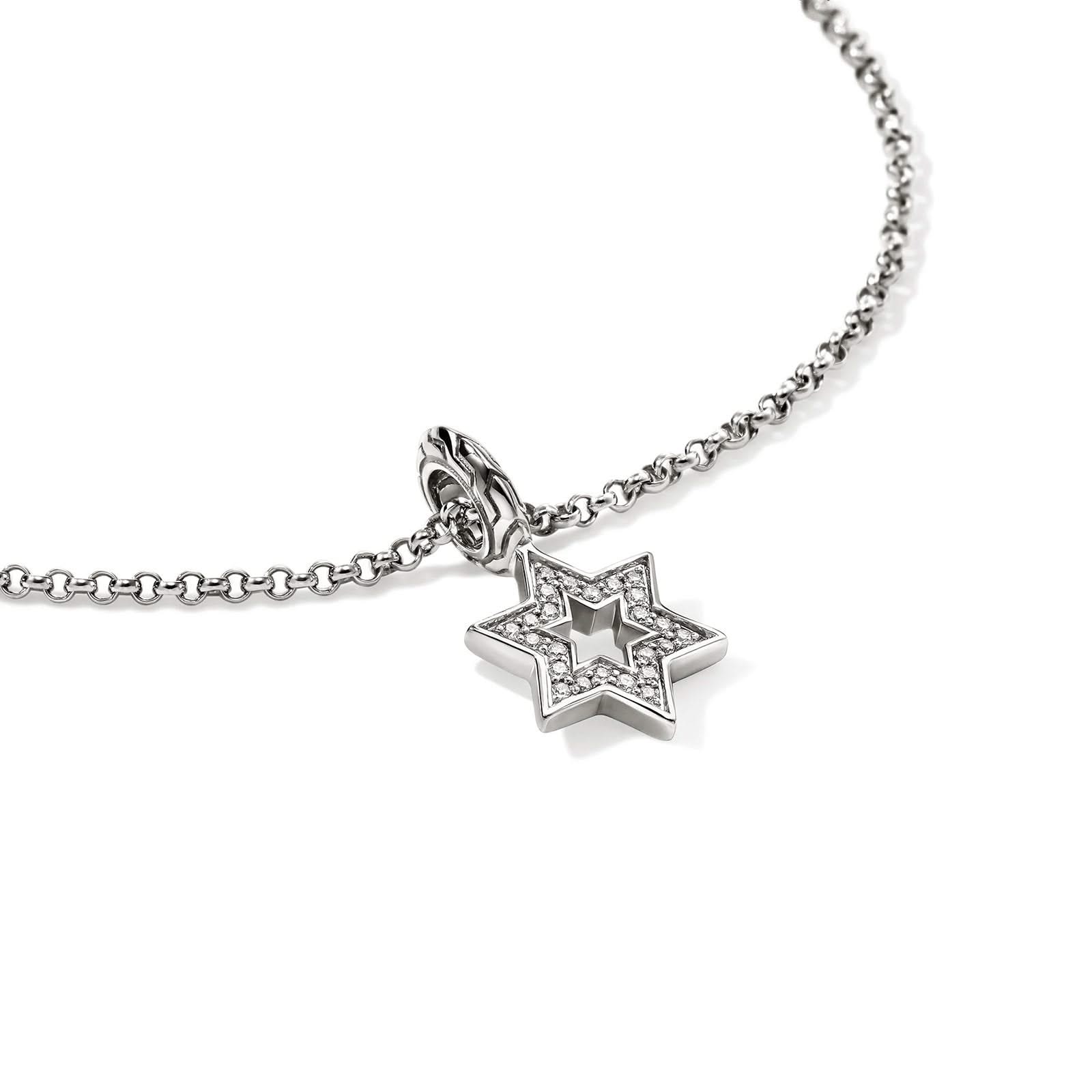 Sterling silver Essential spiritual pave diamond Star of David pendant featuring 24 round brilliant cut diamonds weighing .09 ctw. The necklace is adjustable from 16-18" in length. Designed by John Hardy.