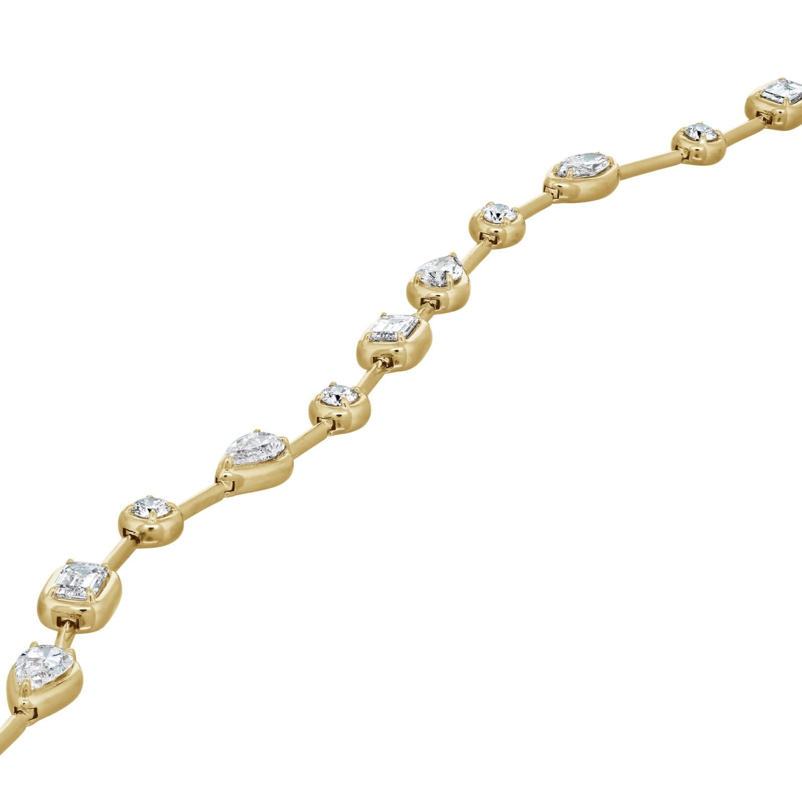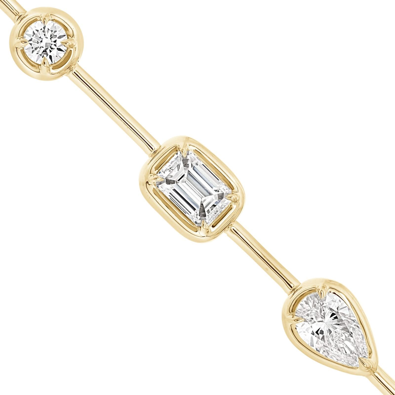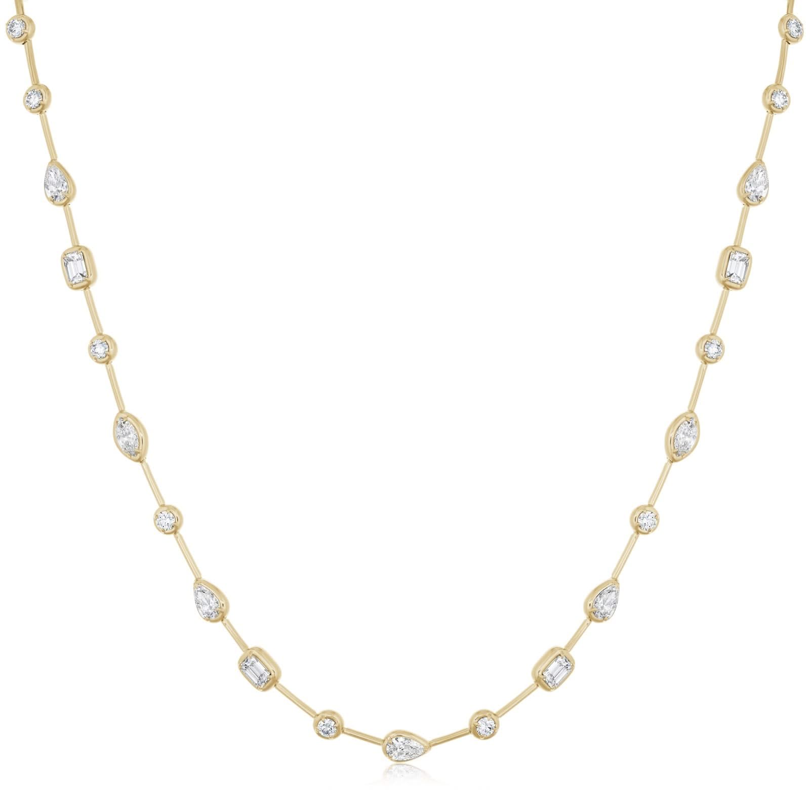 18K yellow gold diamond Starry Night diamond bezel necklace. The necklace features four pear shape diamonds, four emerald cut diamonds, four marquise diamonds, and 22 round brilliant cut diamonds weighing 5.29 ctw. Designed by Kwiat.