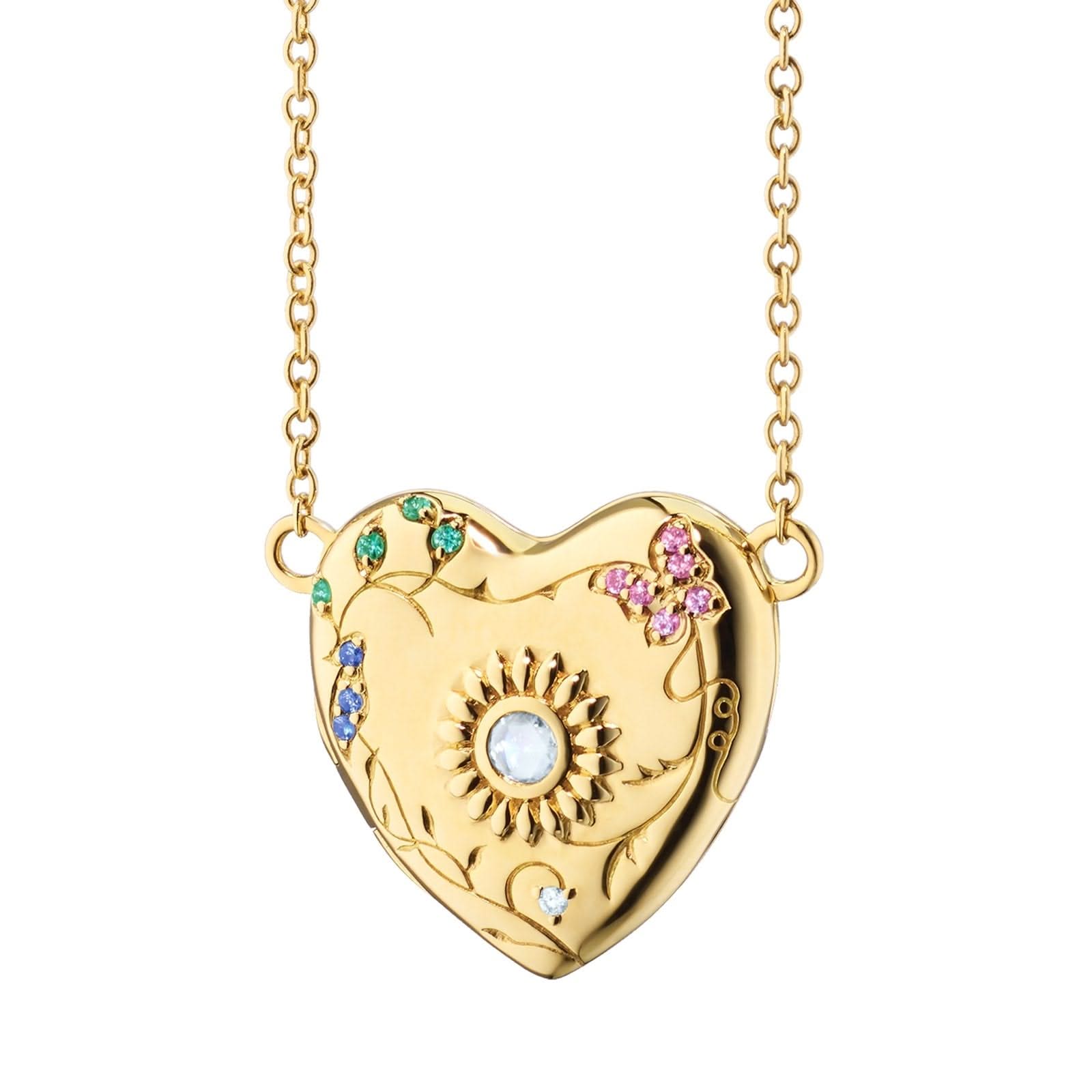 18K yellow gold Secret Garden heart locket necklace featuring a round rose cut diamond weighing .06 ct. The locket also features six round pink sapphires weighing .04 ctw, four round emeralds weighing .02 ctw, and three round blue sapphires weighing .02 ctw. The locket measures 3/4" in height and 13/16" in width and the necklace is adjustable from 16-17-18" in length. Designed by Monica Rich Kosann.