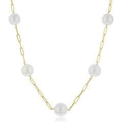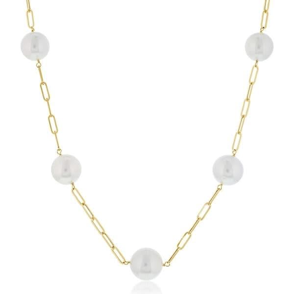 14K yellow gold 36" paperclip pearl necklace from the Reis-Nichols Collection. The necklace features seven white south sea pearls measuring 10.5-11.5mm.