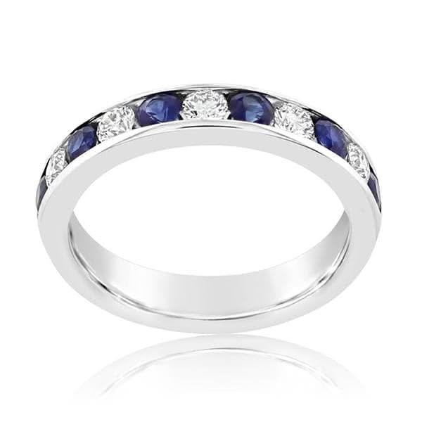 18K white gold sapphire and diamond band from the Reis-Nichols Collection. The band features six round cut blue sapphires weighing .69 ctw and five round brilliant cut diamonds weighing .43 ctw. Size 6 in stock now. Special order sizes also available. Pricing may vary with size of ring.