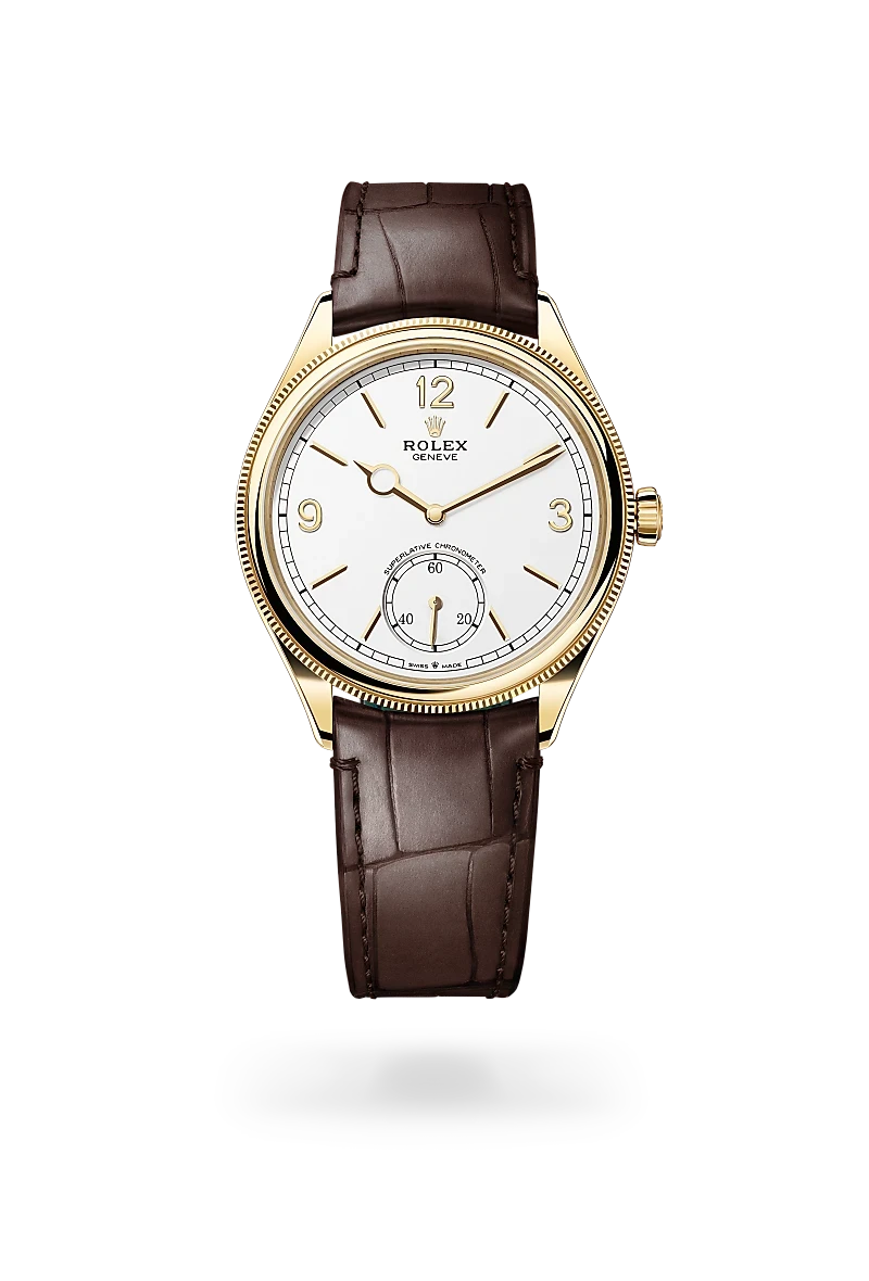 With its 3, 9 and 12 numerals and its small seconds counter at 6 o'clock, the 1908 watch, available in 18 kt yellow or white gold as well as in 950 platinum, revisits the style of an Oyster Perpetual from 1931 and resolutely endows it with modernity. The dial is a model of elegance and sophistication: Arabic numerals and faceted index hour markers in 18 kt gold against an intense white or intense black dial, or an ice blue dial featuring a guilloché rice-grain motif. Protected by a domed sapphire crystal, it features a delicate 'railway' minute track around the circumference. The 1908 is equipped with hands of distinctive styles: the minute hand is shaped like a two-edged sword, while a hand with a pierced circle marks the hours.