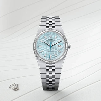Rare and precious, platinum is striking for its silvery whiteness and vibrant luminosity. It is among the densest and heaviest metals in the world, distinguished by unique chemical and physical properties such as exceptional corrosion resistance. Paradoxically, it is also soft, elastic and highly malleable, which makes machining and polishing especially difficult, demanding an extremely high degree of skill. Rolex always uses 950 platinum, an alloy consisting of 950‰ (thousandths) platinum, painstakingly crafted in-house by the fine metalworkers at Rolex. The noblest of metals for the finest of watches.