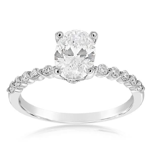 14K white gold diamond engagement ring setting from the Reis-Nichols Collection. The band features 25 round brilliant cut diamonds weighing approximately 1/3 ctw. The ring is designed to hold a 1 ct oval center diamond. Center diamond sold separately. Size 6.5 in stock now. Special order sizes also available. Pricing may vary with size of ring.