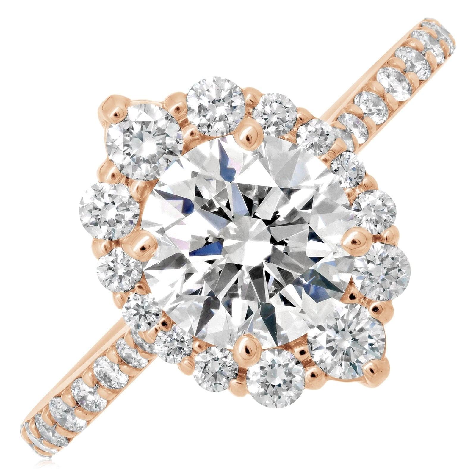 14K rose gold diamond engagement ring setting designed and created by Reis-Nichols Jewelers. The ring setting features 34 round brilliant cut diamonds weighing .62 ctw. Size 6.75 in stock now. Center sold separately. The ring setting is designed to hold a 1 .50ct round center diamond. Special order sizes available. Pricing may vary with size.