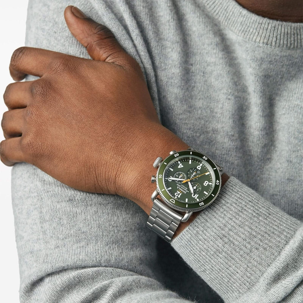 Titanium Shinola Runwell Sport Chronograph Gift Set quartz watch featuring a dark olive index/arabic date dial with a titanium green aluminum insert unidirectional bezel. The watch case is 48mm and is attached to a titanium bracelet. The gift set comes with a brown leather strap.