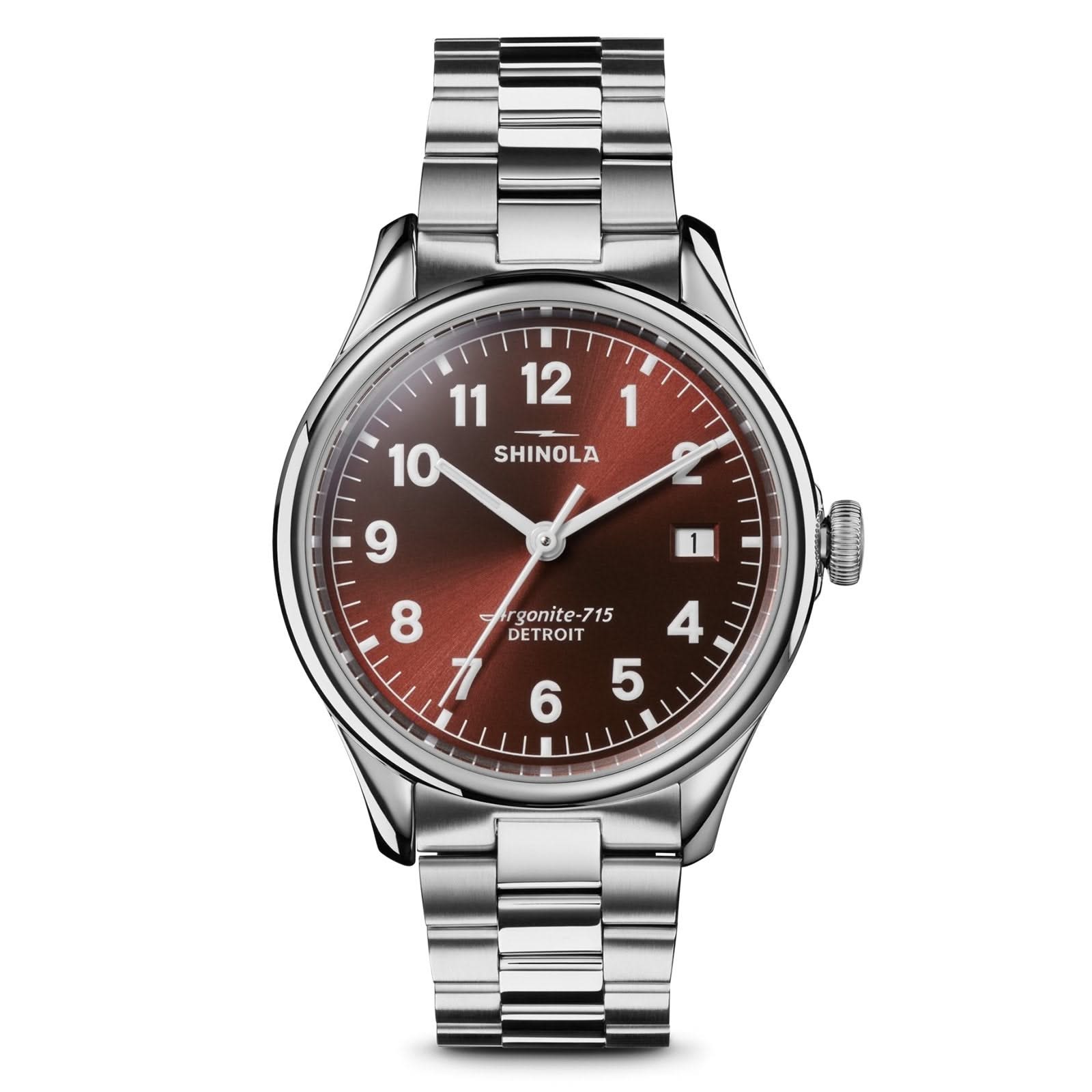 Stainless steel Shinola Vinton quartz watch featuring a whiskey brown arabic date dial with a stainless steel bezel and case. The watch case is 38mm and is attached to a stainless steel bracelet. Style number S0120315331.