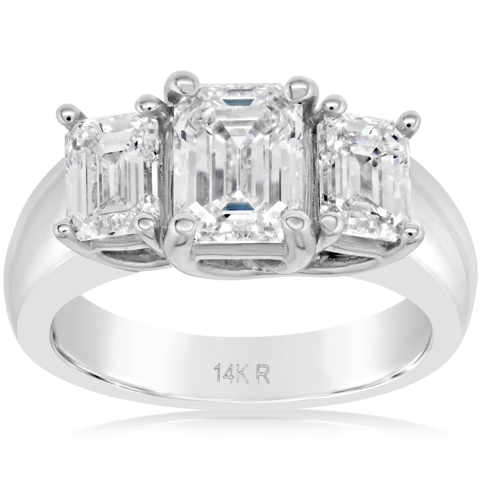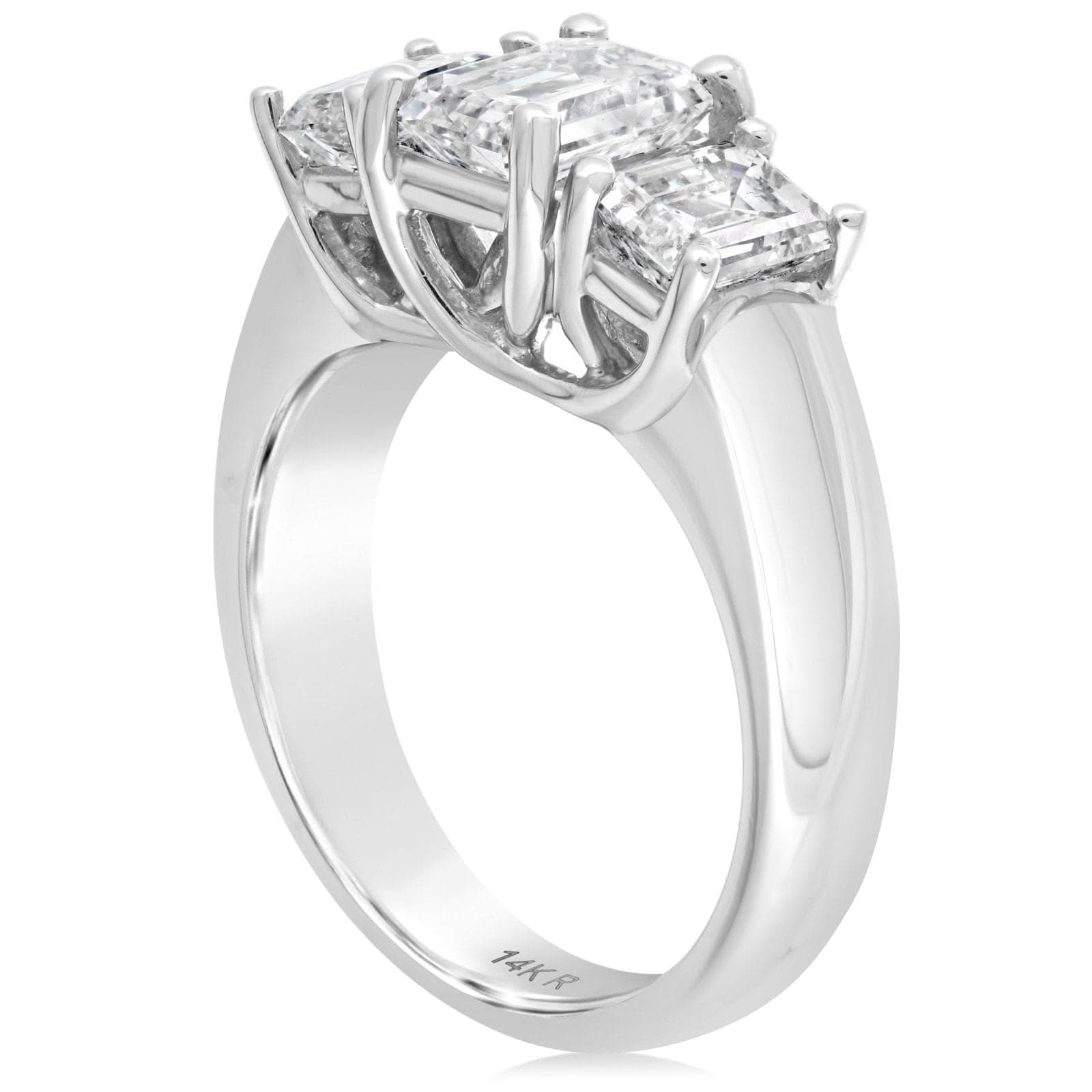14K white gold diamond three stone ring from the Reis-Nichols Collection. The ring features one emerald cut center diamond weighing 1.61 ct and two emerald cut diamond side diamonds weighing 1.56 ctw. Size 7 in stock now. Special order sizes available. Pricing may vary with size of ring.