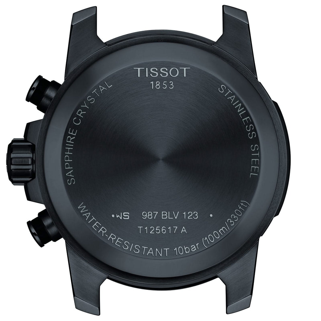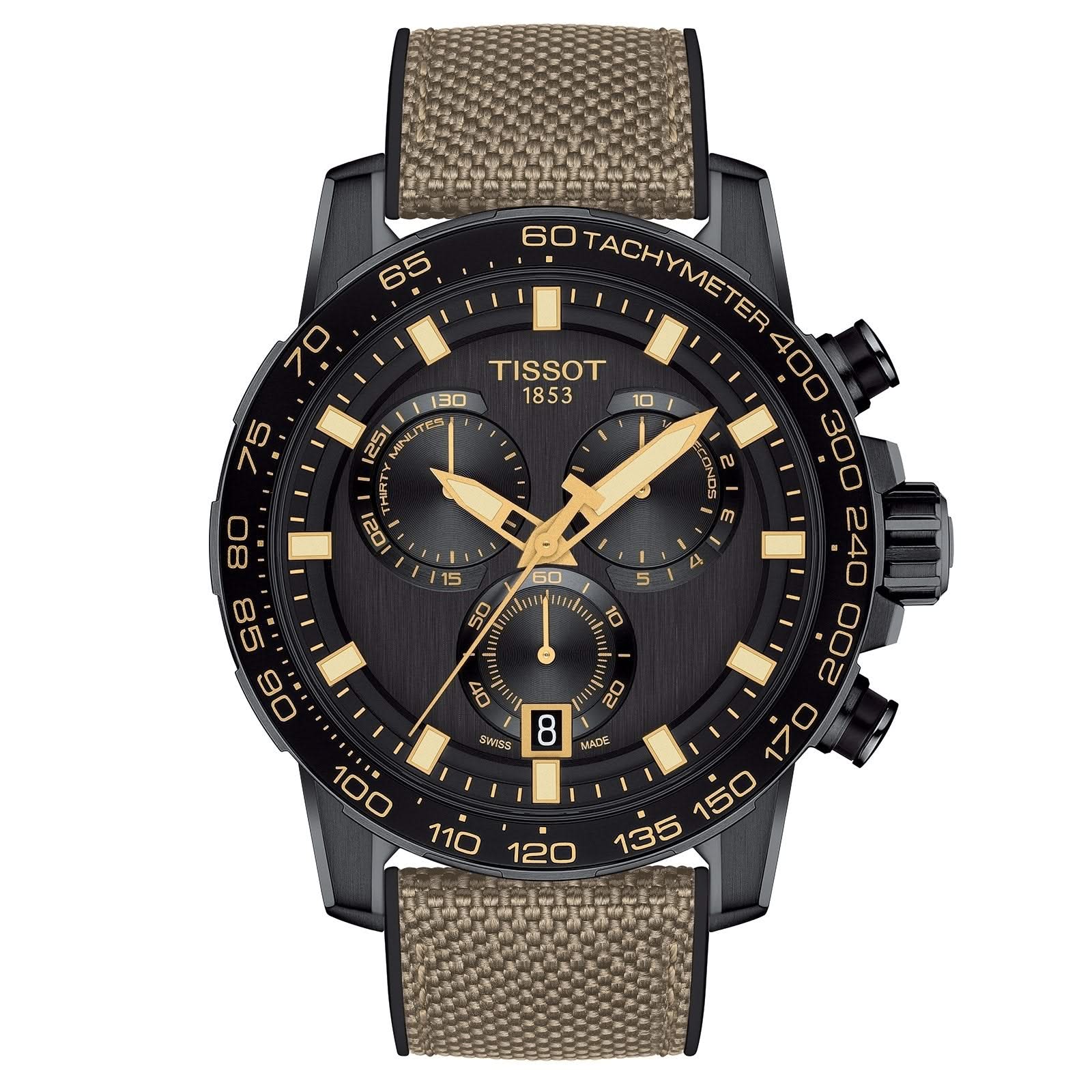 Black PVD Tissot Supersport Chronograph quartz watch featuring a black index date dial with black subdials and a black PVD tachymeter bezel. The watch case is 45.5mm and is attached to a black and beige leather strap.