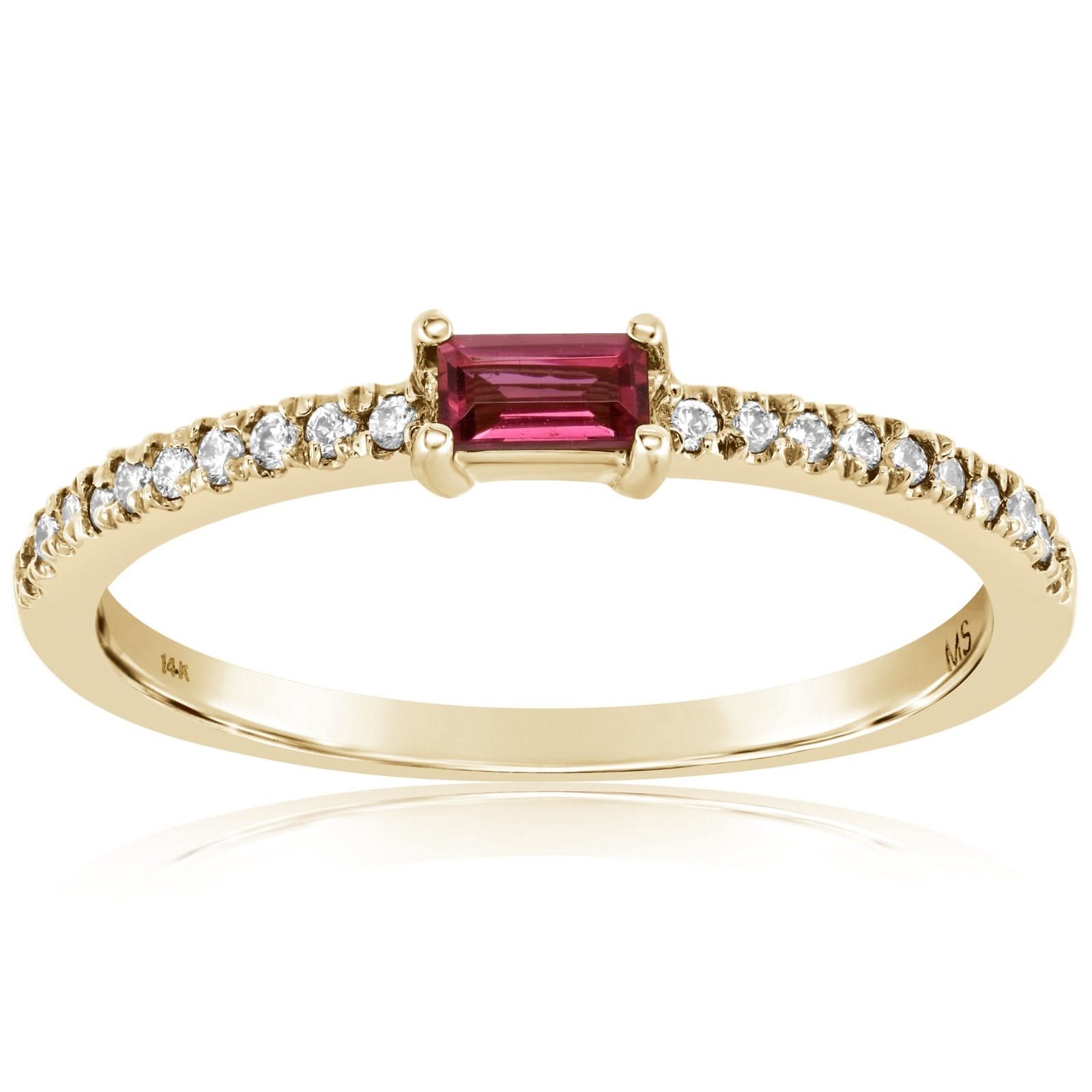 14K yellow gold tourmaline and diamond ring featuring a baguette cut tourmaline weighing .14 ctw and 20 round brilliant cut diamonds weighing .12 ctw. Size 6.75 in stock now. Special order sizes also available. Designed by My Story.