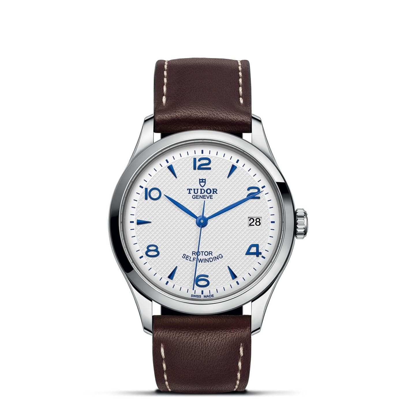 Stainless steel TUDOR 1926 automatic watch featuring an opaline and blue arabic/index date dial with a high polished bezel and case. The watch case is 36mm and is attached to a brown leather strap.
