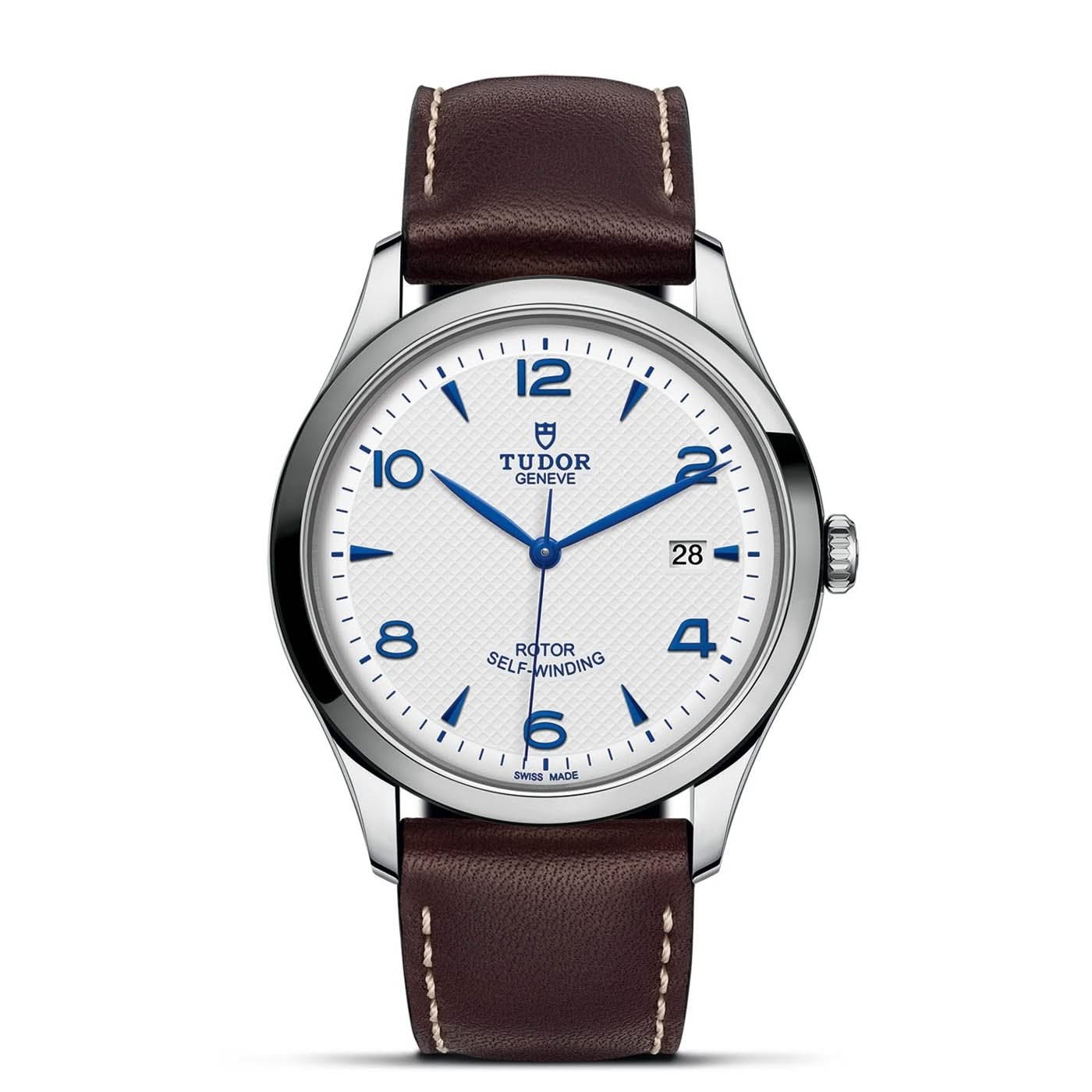 Stainless steel TUDOR 1926 automatic watch featuring an opaline embossed index/arabic date dial with a high polished bezel and case. The watch case is 41mm and is attached to a brown leather strap.