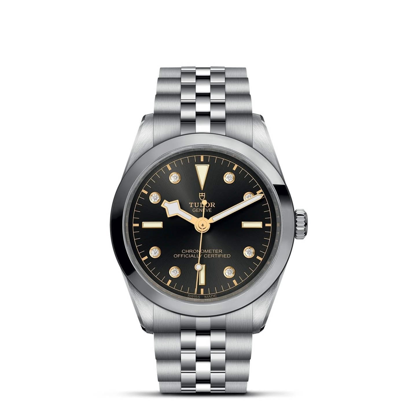 Stainless steel Tudor Black Bay automatic watch featuring a black index diamond dial with a stainless steel bezel and case. The watch case is 36mm and is attached to a stainless steel bracelet.