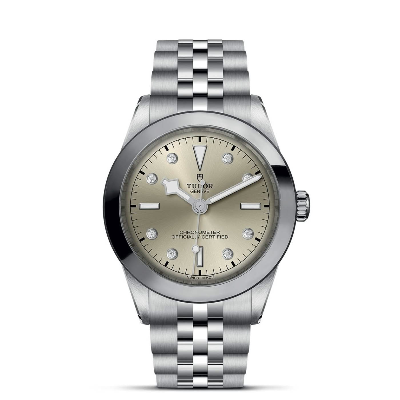 Stainless steel TUDOR Black Bay automatic watch featuring a light champagne diamond/index dial with a stainless steel bezel and case. The watch case is 39mm and is attached to a stainless steel bracelet.