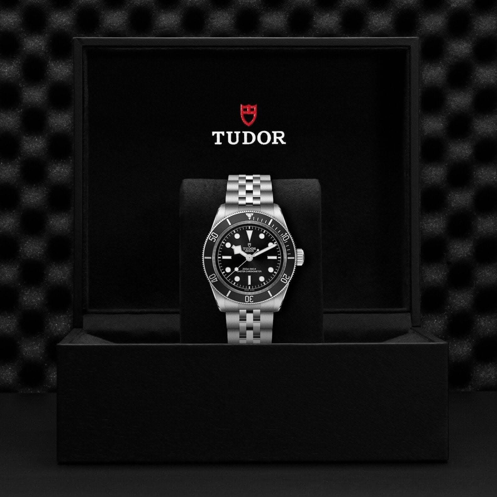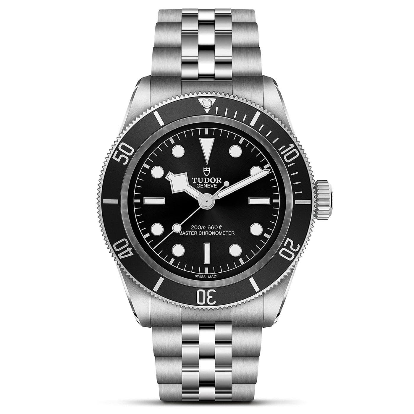 Stainless steel Tudor Black Bay automatic watch featuring a black index dial with a stainless steel black aluminum insert bezel and case. The watch case is 41mm and is attached to a stainless steel five-link bracelet.