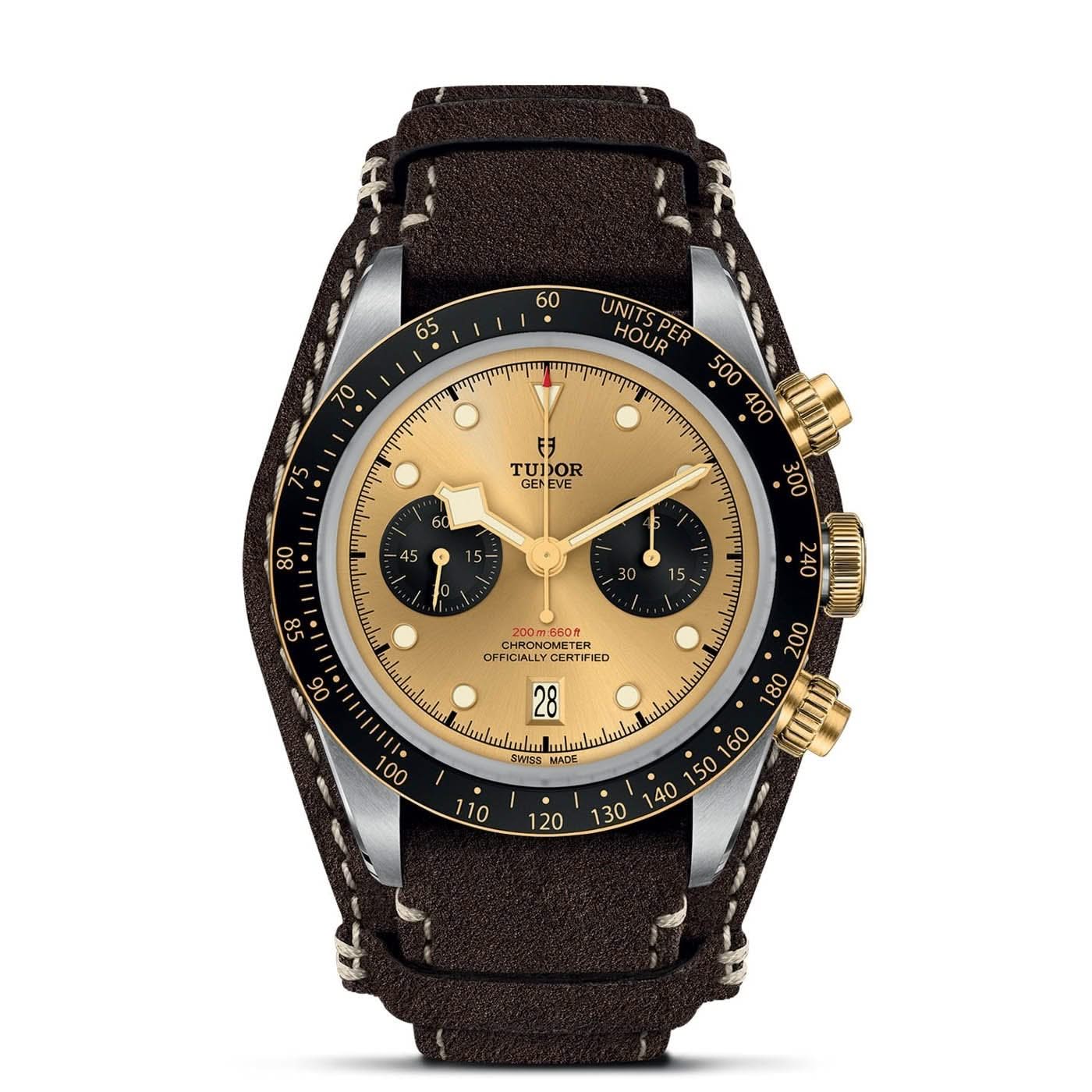 Stainless steel and 18K yellow gold TUDOR Black Bay Chrono S&G automatic watch featuring a champagne index date dial with black subdials and an 18K yellow gold black aluminum tachymeter bezel. The watch case is 41mm and is attached to a brown leather strap with a removable band.