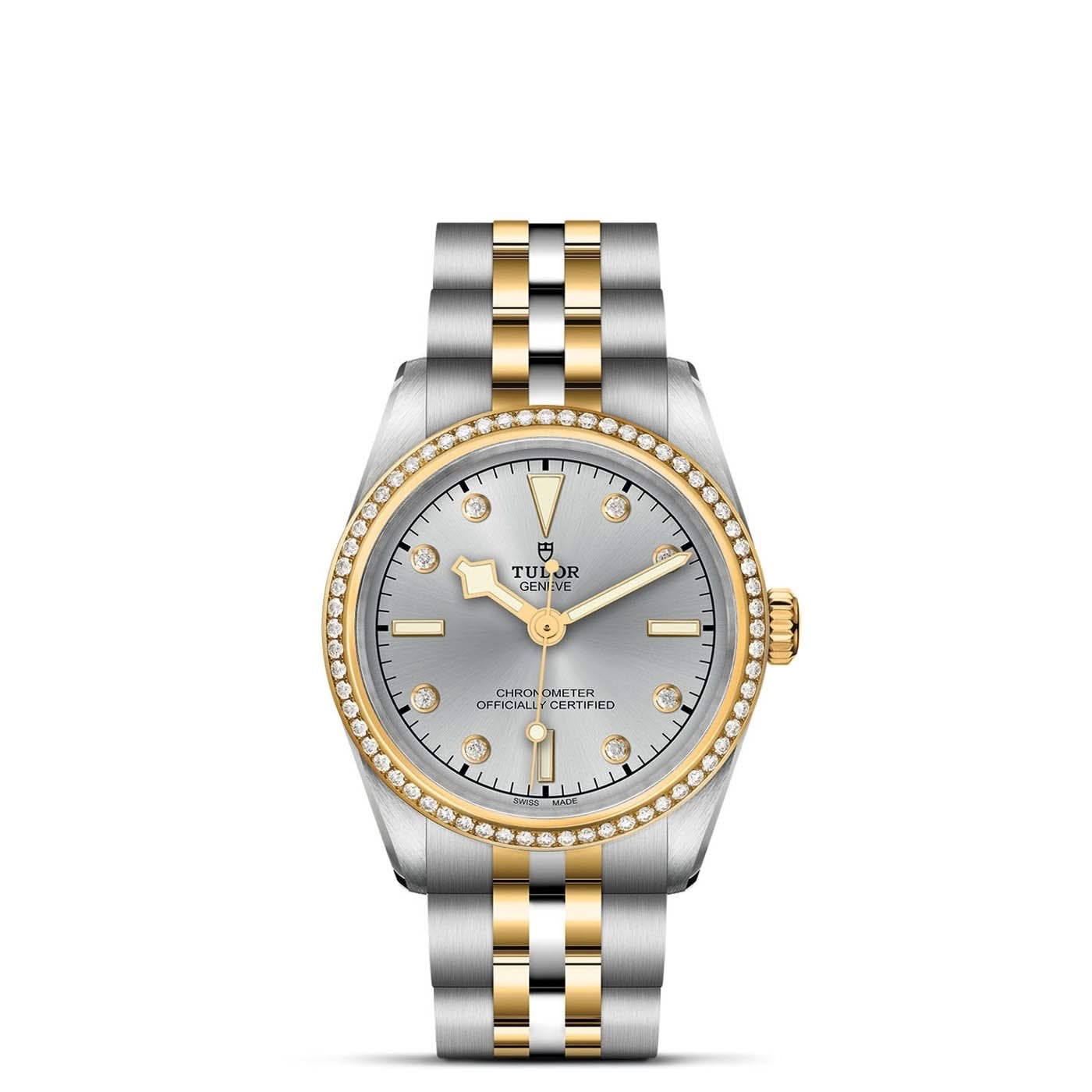 Stainless steel and 18K yellow gold Tudor Black Bay S&G automatic watch featuring a silver index/diamond dial with an 18K yellow gold diamond bezel and a stainless steel case. The watch case is 31mm and is attached to a stainless steel and 18K yellow gold bracelet.