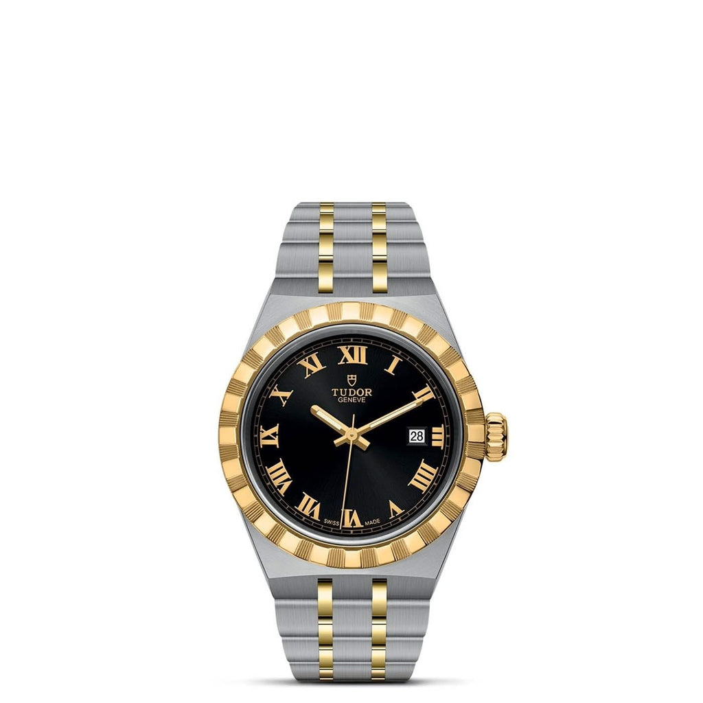 Stainless steel and 18K yellow gold TUDOR Royal automatic watch featuring a white mother-of-pearl diamond/Roman date dial with an 18K yellow gold diamond bezel. The watch case is 28mm and is attached to a stainless steel and 18K yellow gold bracelet.