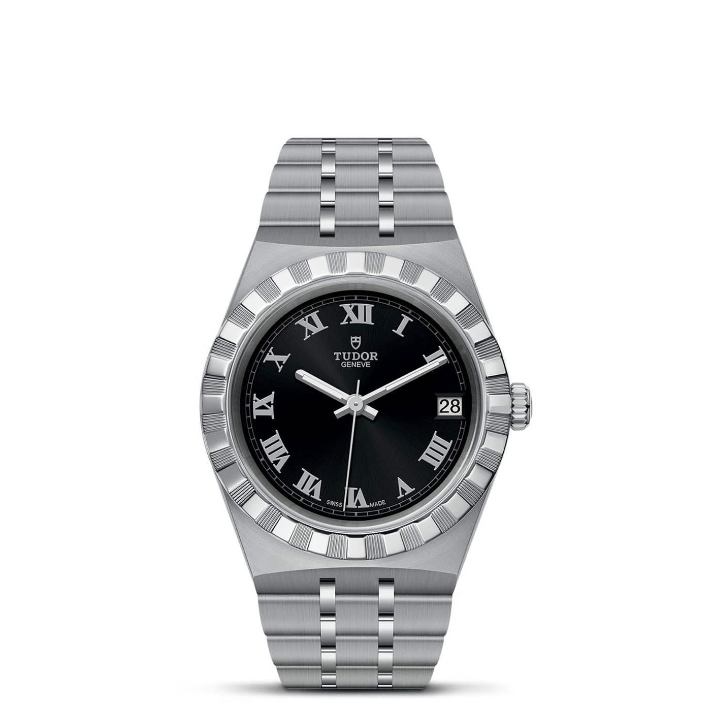 Stainless steel TUDOR Royal automatic watch featuring a black Roman date dial with a stainless steel notched bezel. The watch case is 34mm and is attached to a stainless steel bracelet.