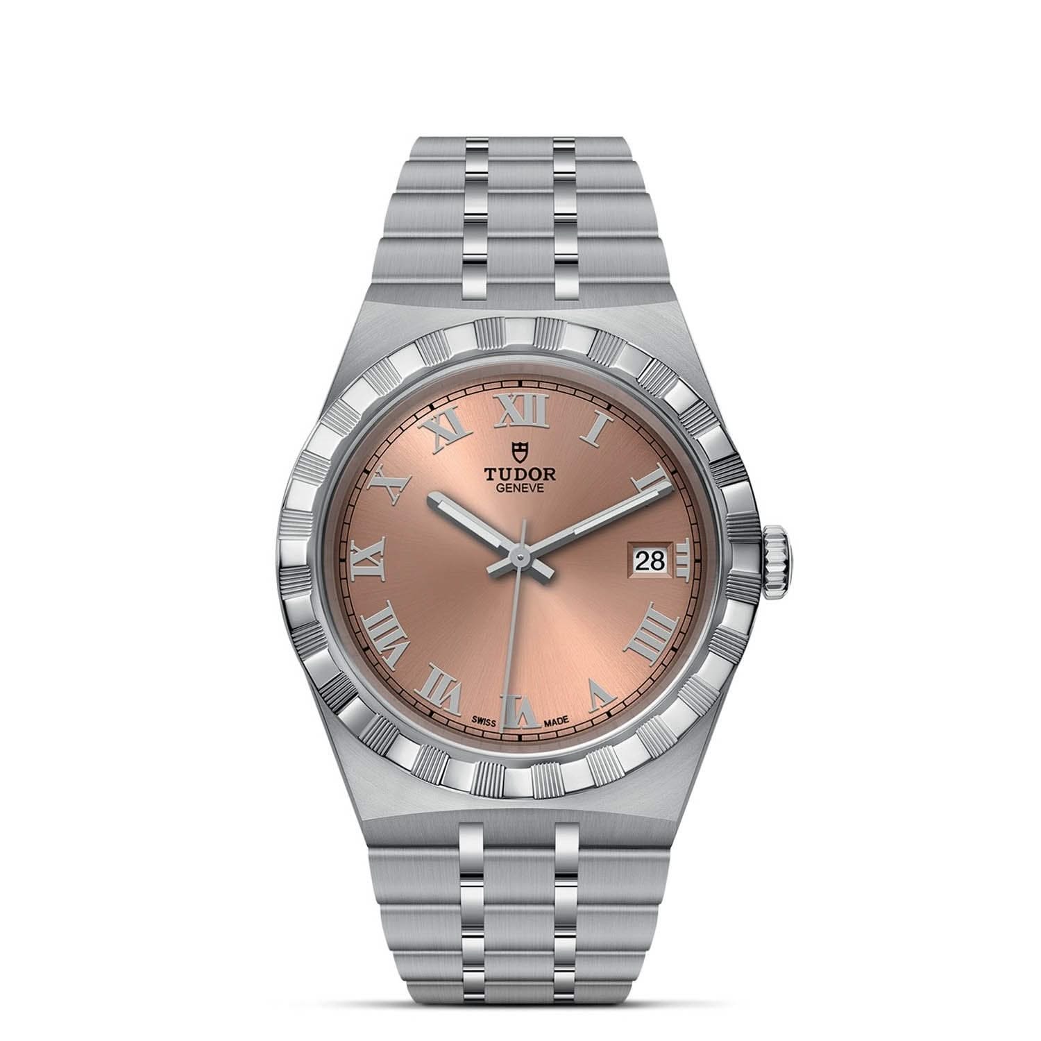 Stainless steel TUDOR Royal automatic watch featuring a salmon Roman date dial with a stainless steel notched bezel. The watch case is 38mm and is attached to a stainless steel bracelet.