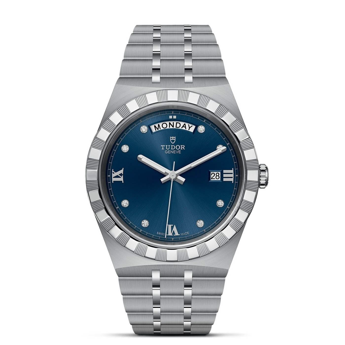 Stainless steel TUDOR Royal automatic watch featuring a blue Roman/diamond date dial with a stainless steel notched bezel. The watch case is 41mm and is attached to a stainless steel bracelet.