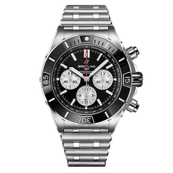 Reference# AB0136251B1A1, 44mm diameter, Stainless Steel - Breitling’s supercharged watch for your every pursuit. The Super Chronomat is inspired by the original 1980s Chronomat that Breitling created for the hotshots of aerobatic squadrons. The boldest of all Chronomat watches, the Super Chronomat features several ceramic inserts – on the bezel, on the chronograph pushers and on the crown – as well as a Rouleaux-inspired rubber strap. Still, this all-purpose sports watch won’t get in the way of your sense of style. The Super Chronomat comes in several colour and metal variations, from stainless steel to 18 k red gold. It either features the iconic Rouleaux bracelet or a rubber Rouleaux-inspired strap, matched with a folding clasp. The Super Chronomat B01 44 is powered by the Breitling Manufacture Calibre 01, a COSC-certified chronometer. If you would like to make your Breitling more personal, Reis-Nichols Jewelers offers engraving as well as bracelet and strap adjustments on your Breitling purchase.