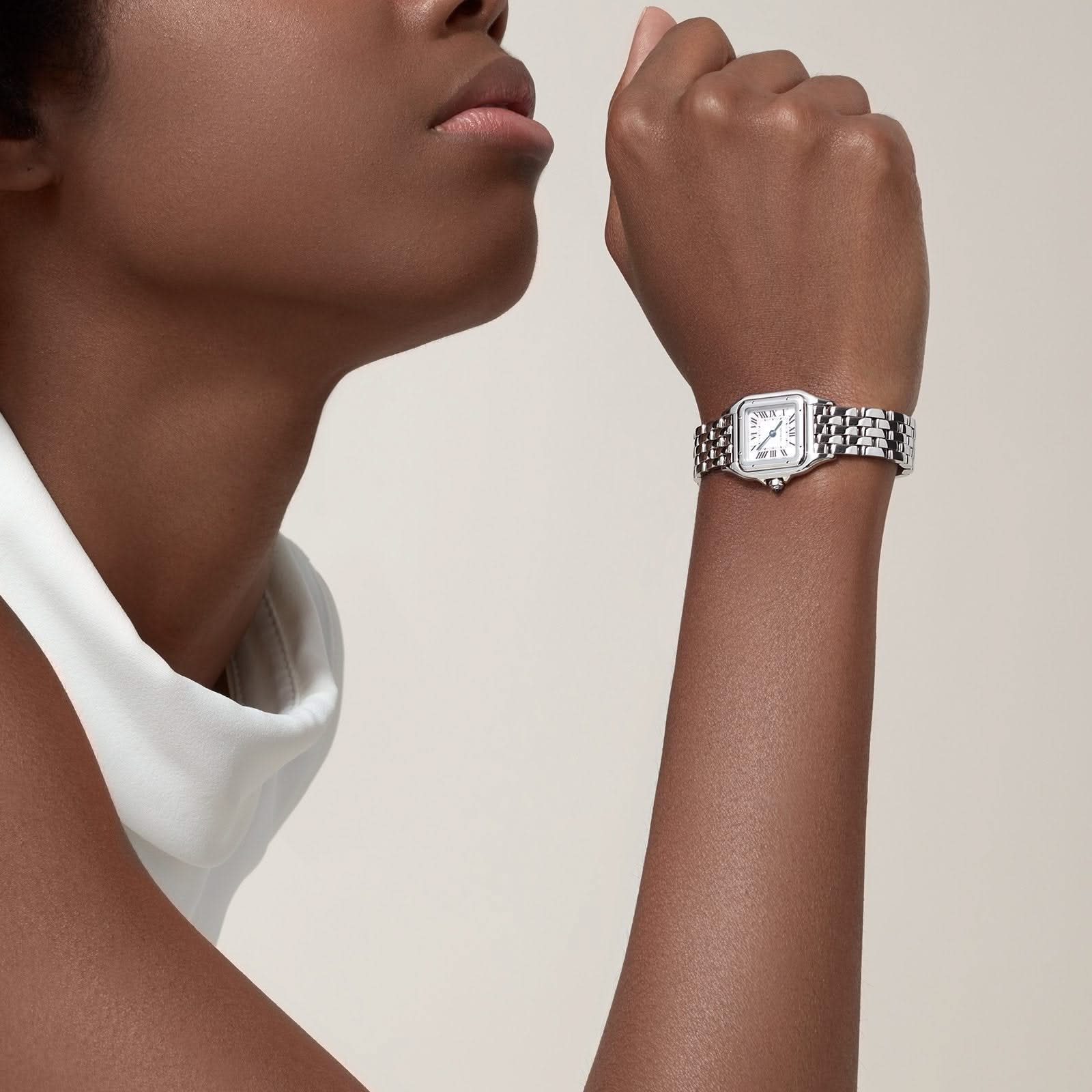 Stainless steel Cartier Panthere Small quartz watch featuring a silver Roman dial with a stainless steel bezel and case. The watch case is 23mm x 30mm and is attached to a stainless steel bracelet.