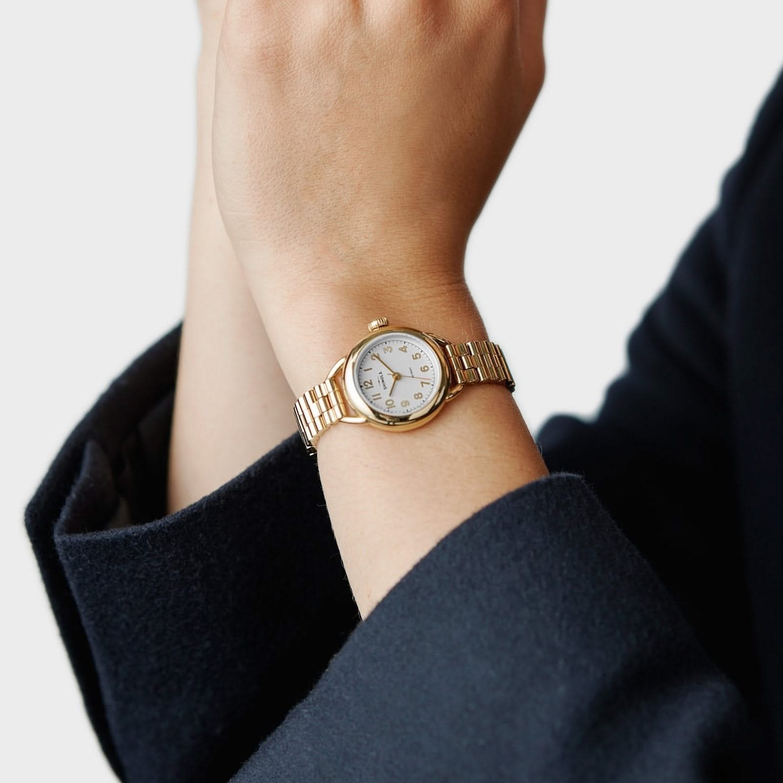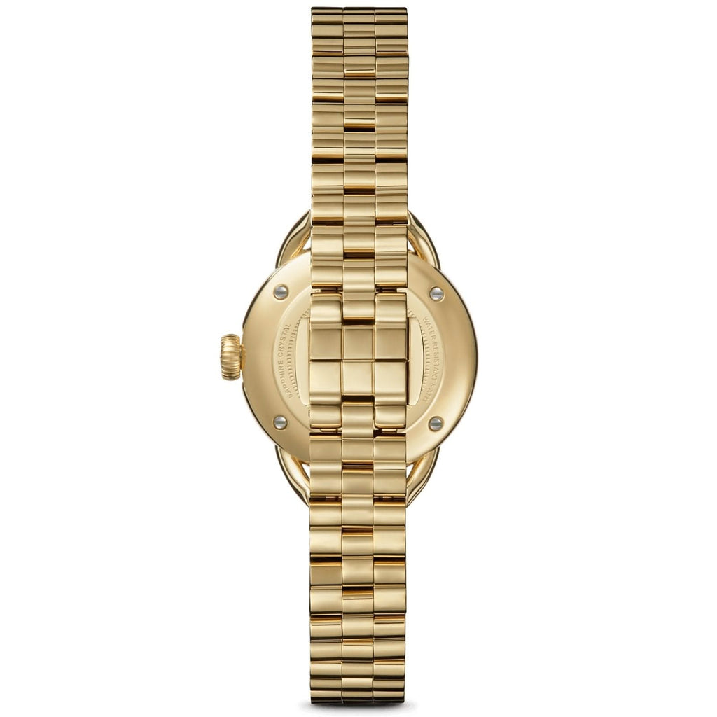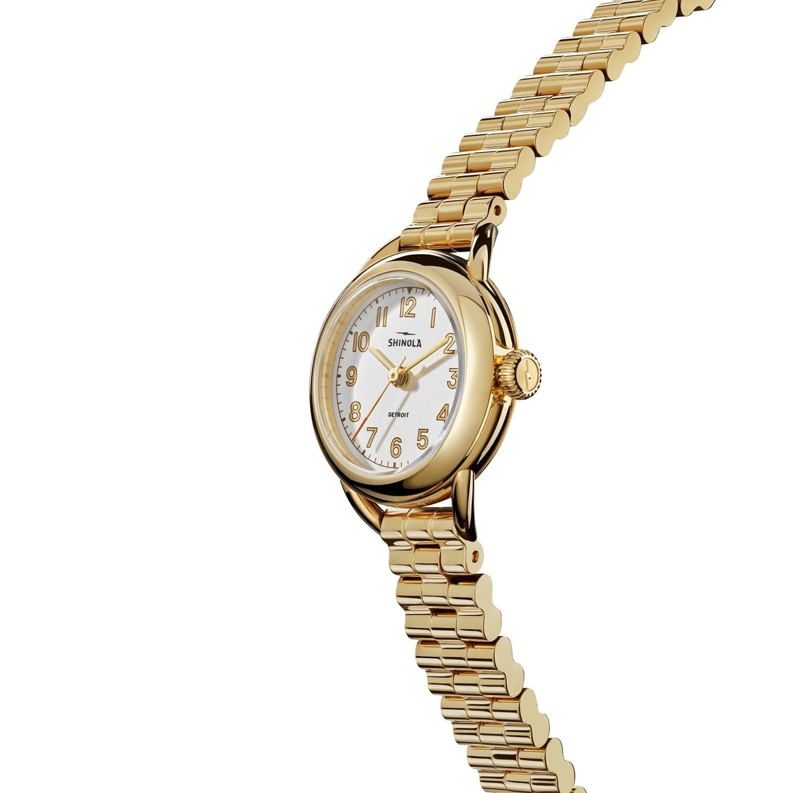 Yellow gold plated Shinola Runabout 25mm quartz watch featuring a silver arabic dial with a yellow gold plated bezel and case. The watch is attached to a yellow gold plated bracelet.