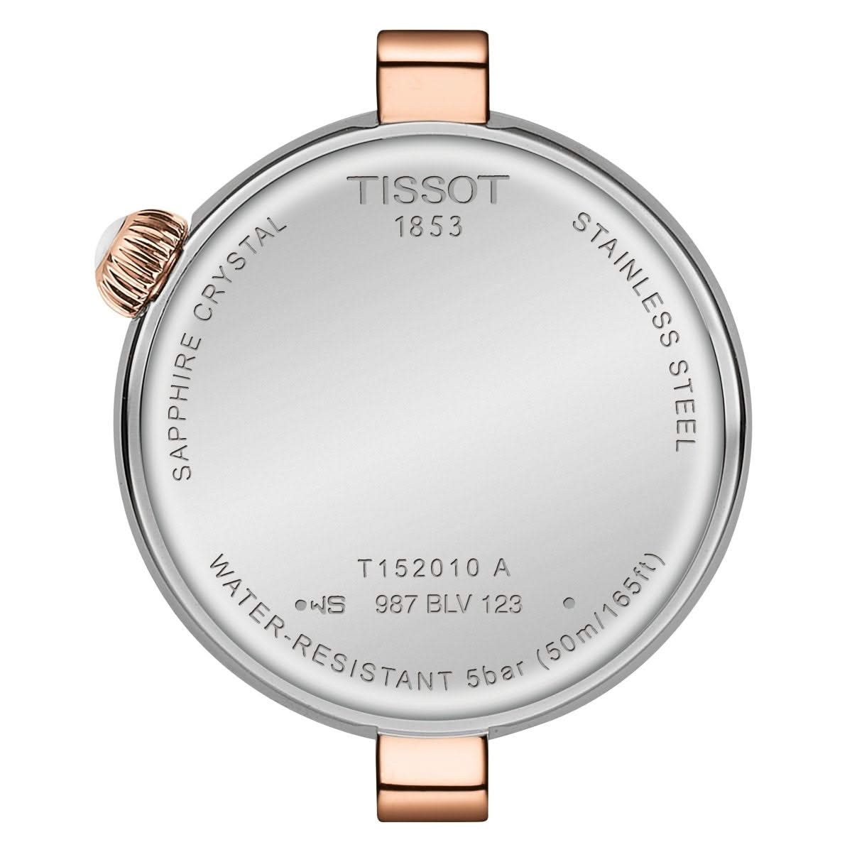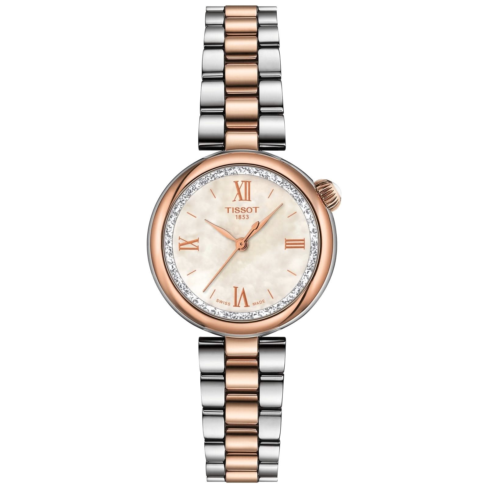 Stainless steel and rose gold PVD Tissot Desir quartz watch featuring a white mother-of-pearl Roman/index diamond dial with a rose gold PVD bezel and a stainless steel case. The watch case is 28mm and is attached to a stainless steel and rose gold PVD bracelet.