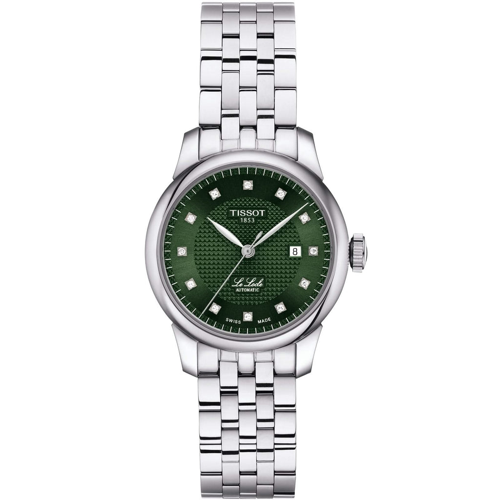 Stainless steel Tissot Le Locle automatic watch featuring a green diamond date dial with a stainless steel bezel and case. The watch case is 29mm and is attached to a stainless steel bracelet.