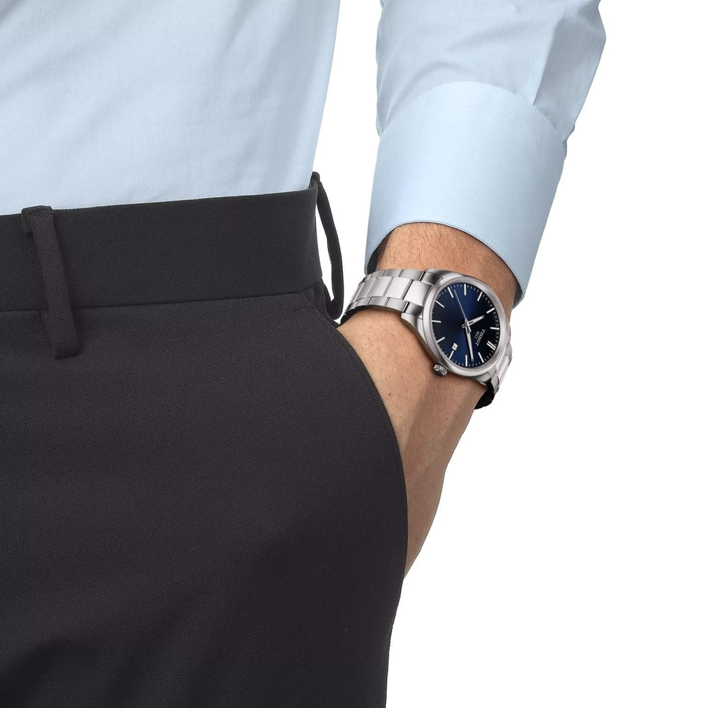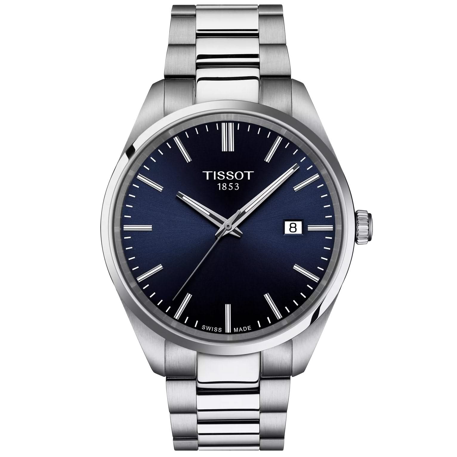 Stainless steel Tissot PR100 quartz watch featuring a blue index date dial with a stainless steel bezel and case. The watch case is 40mm and attached to a stainless steel bracelet.