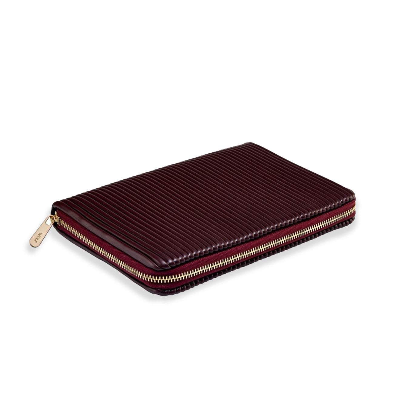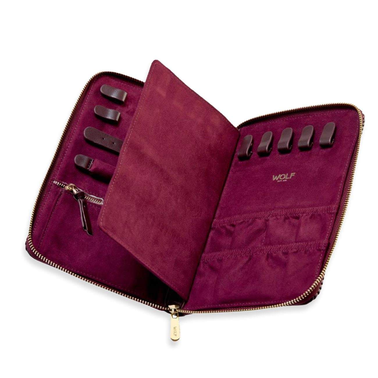 Wolf Bella jewelry portfolio in bordeaux color. Pleated exterior with gold-finish hardware, LusterLoc lined storage for rings and earrings, a zip compartment, 5 necklace and 4 bracelet snap closure hooks with elasticated pouches to prevent tangling. Style number 781426.