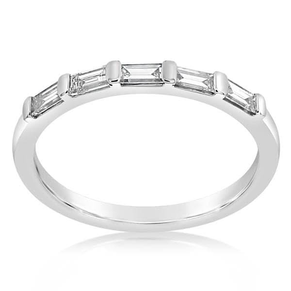 14K white gold diamond wedding band from the Reis-Nichols Collection. The band features five baguette cut diamonds weighing approximately 1/3 ctw. Size 7 in stock now. Special order sizes also available. Pricing may vary with size of ring.