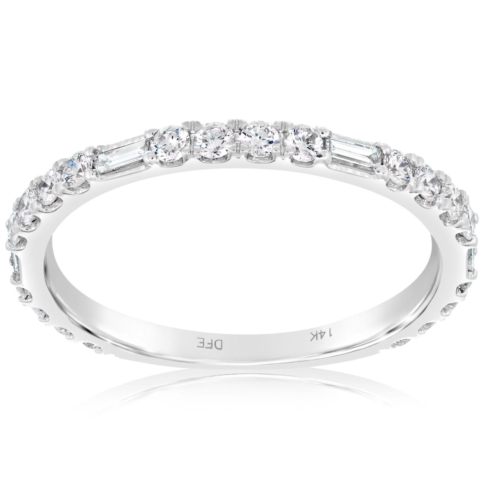 14K white gold wedding band from the Reis-Nichols Collection. The band features twenty brilliant round diamonds and four baguette cut diamonds weighing .50 ctw. Size 6.5 in stock. Special order sizes also available. Pricing may vary with size.